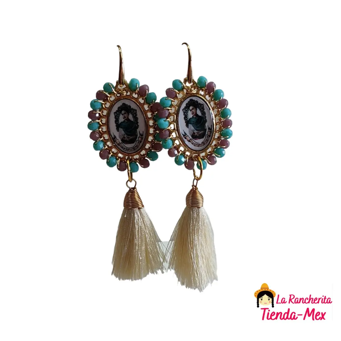 Nuestros Aretes De Chaquira Con Imagen fusionan la riqueza de la chaquira con la belleza espiritual de imágenes religiosas o personajes. Cada par de aretes es una obra maestra, elaborada con chapa de oro, piedras de cristal y detalles de pompones que agregan un toque distintivo y alegre.