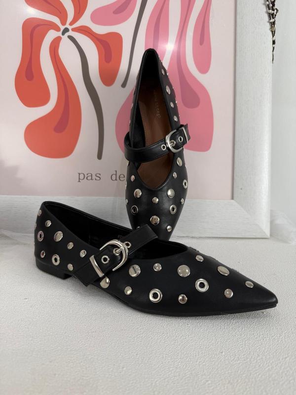 Zapato plano de polipiel negro con tachas plateadas.