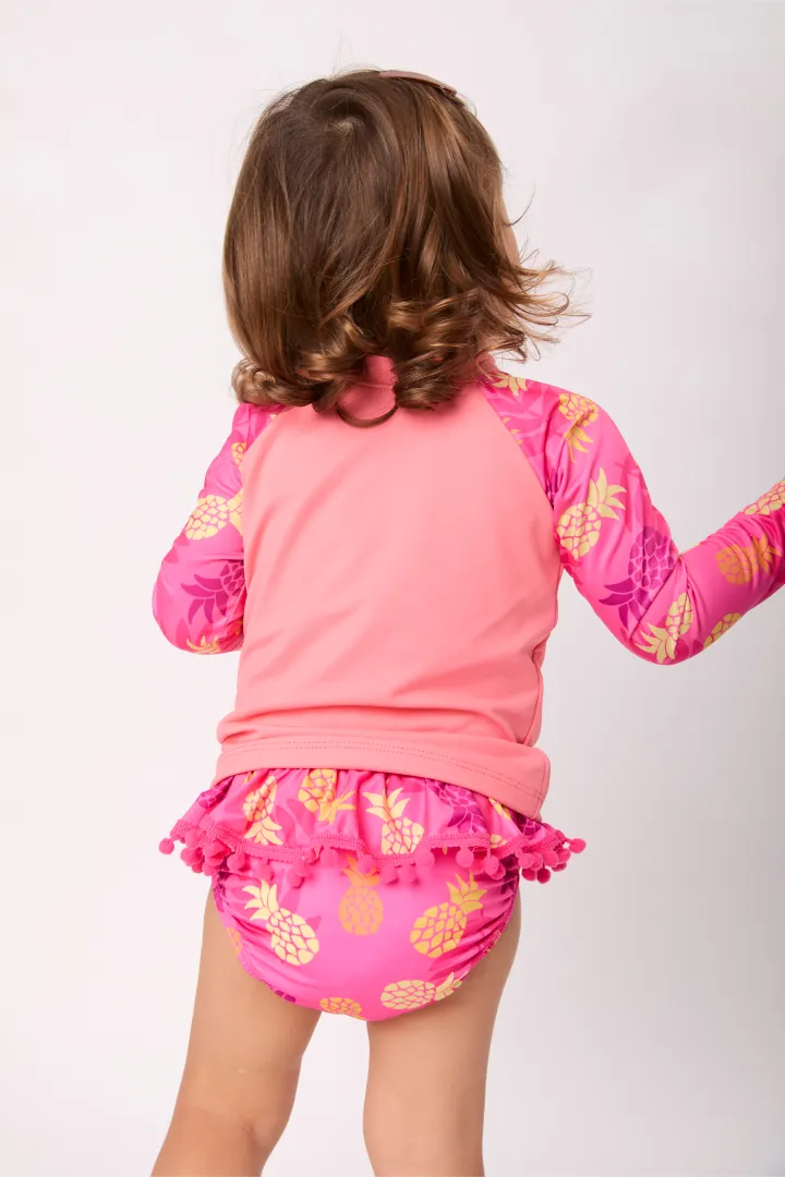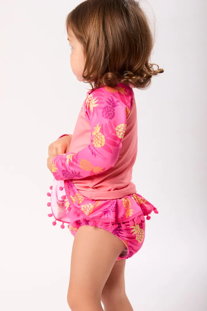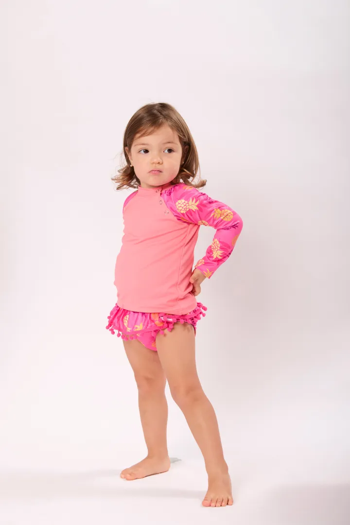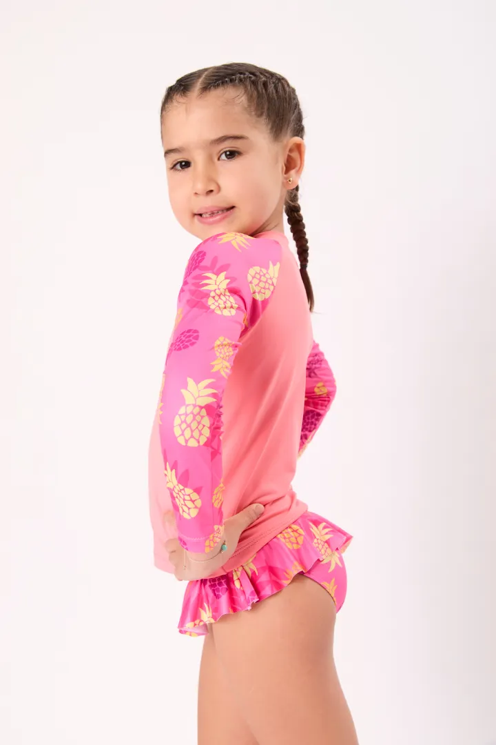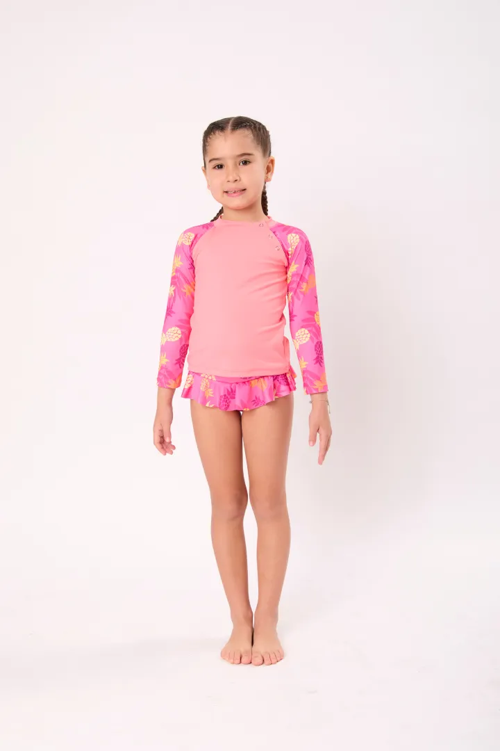 Polo manga larga con botones en parte delantera superior para fácil cambiado. Calzón con bobos. Protección UPF 50+.
