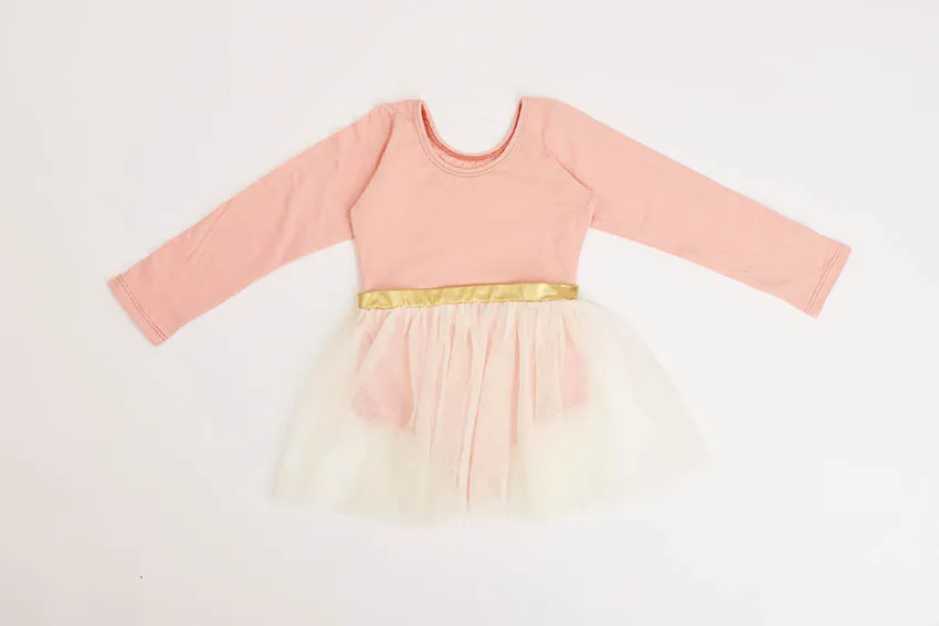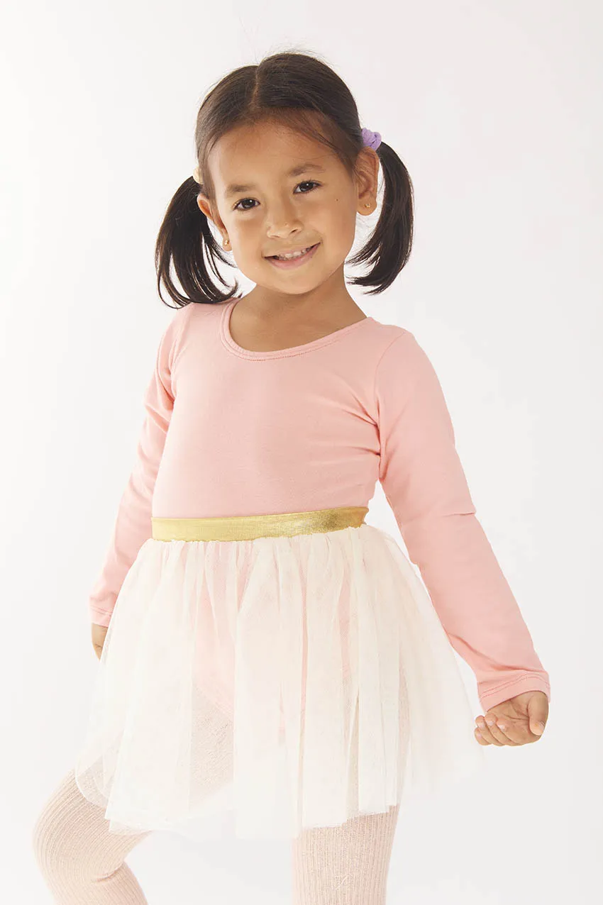 Body manga larga licrado con falda de tull cosida en cintura, con pretina dorada.