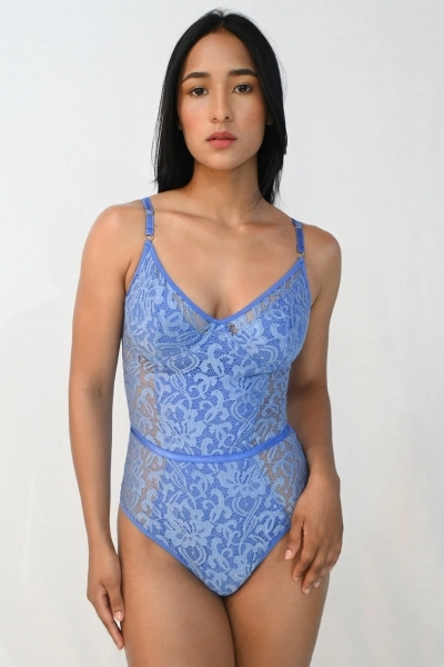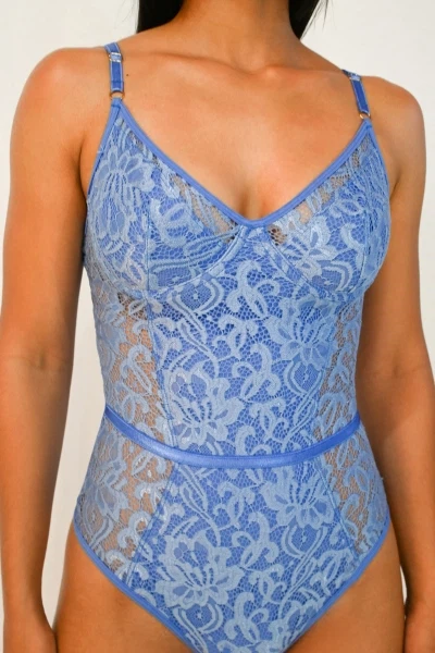 Siente la confianza y la belleza que proporciona el encaje azul de nuestro body. Compra ahora y experimenta la comodidad y el estilo en cada paso que des.