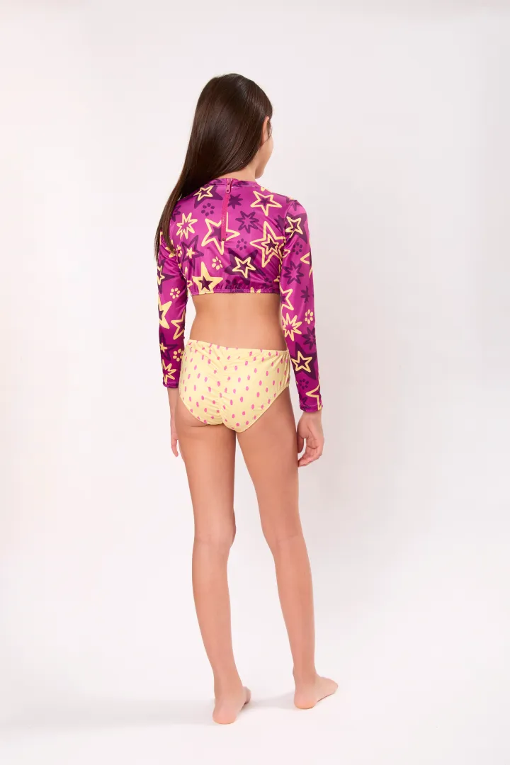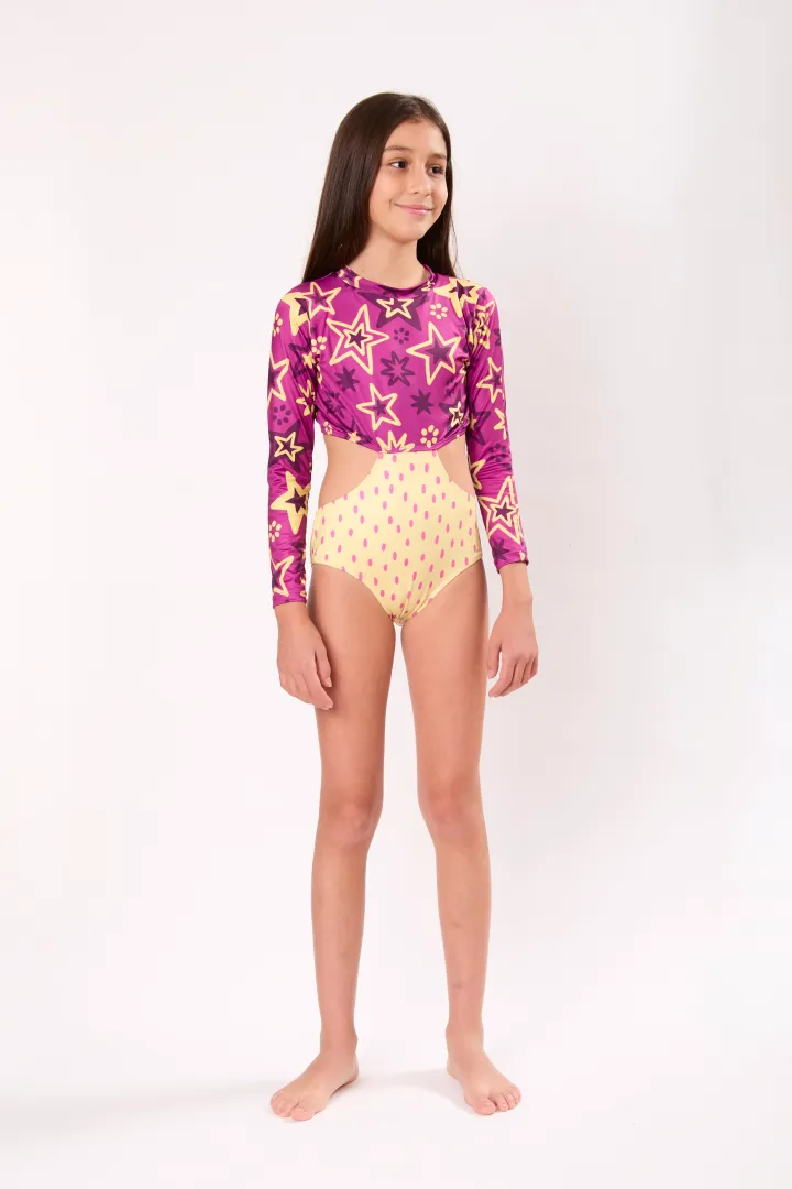 Trikini manga larga con mitad de la espalda abierta y cierre en parte trasera del cuello. Protección UPF 50+.