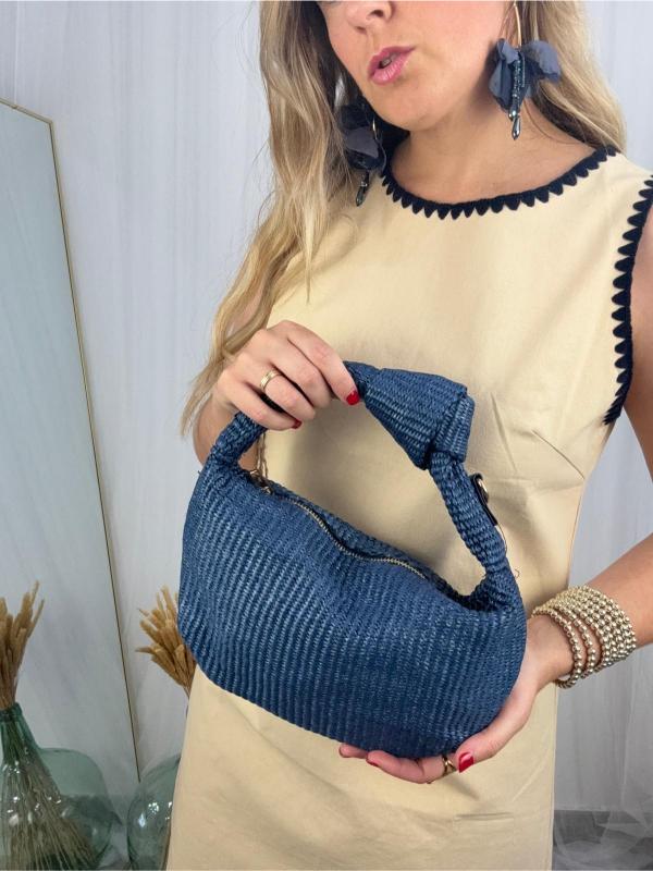 Bolso estilo rafia con detalle de nudo, puedes llevarlo de mano o bandolera. Tamaño perfecto para llevar todo lo necesario.