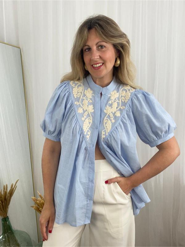 Camisa tejido viscosa muy suave en color azul con bordados de manga corta abullonada.