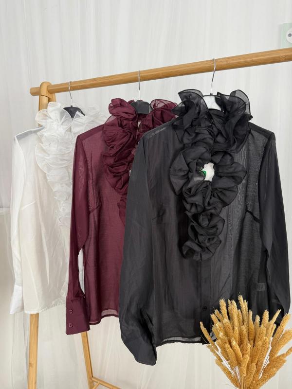 Camisa de tejido semi transparente muy suave con detalle de volantes.