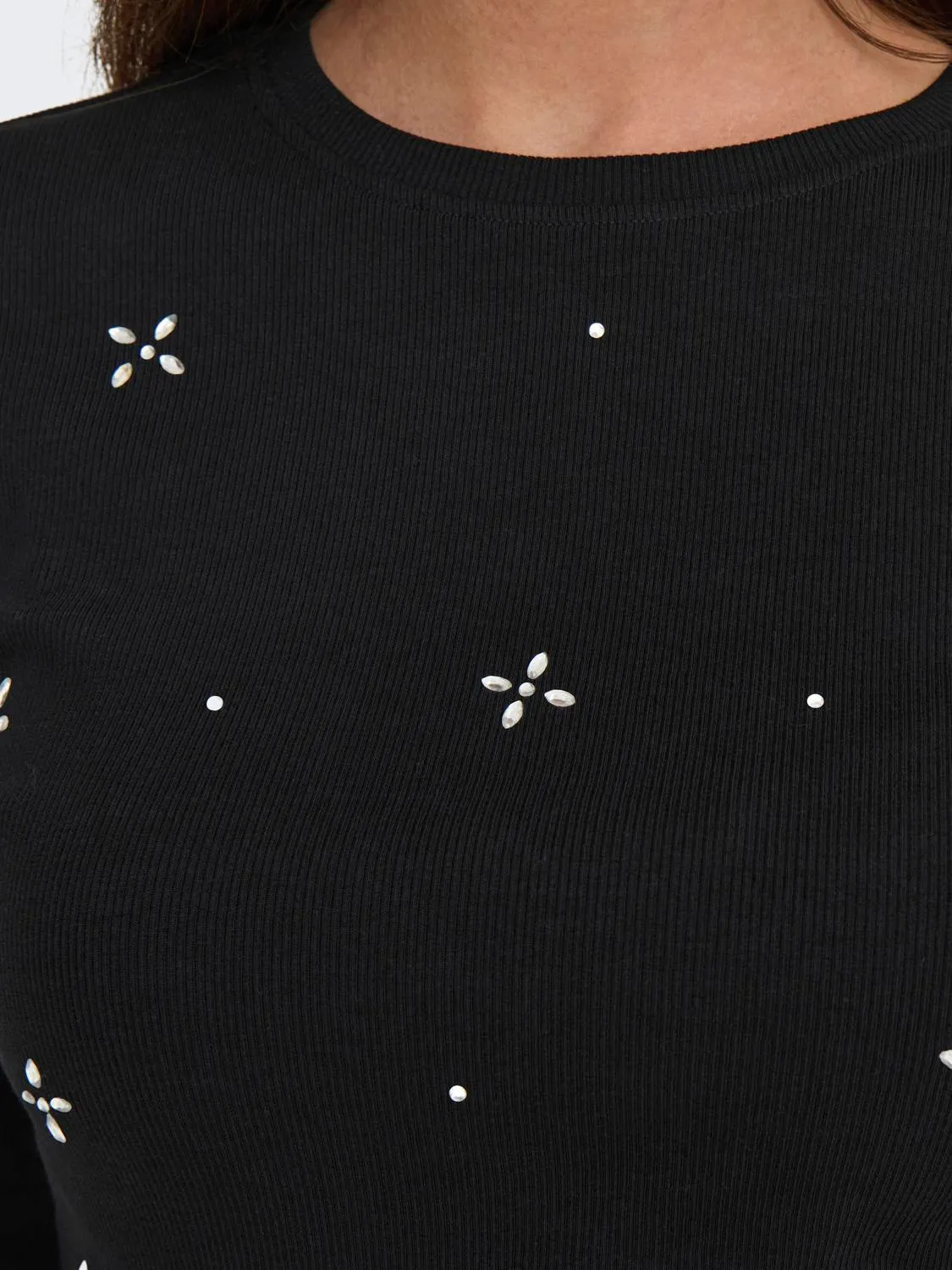 Camiseta de manga larga tipo canalé con detalle de brillos.