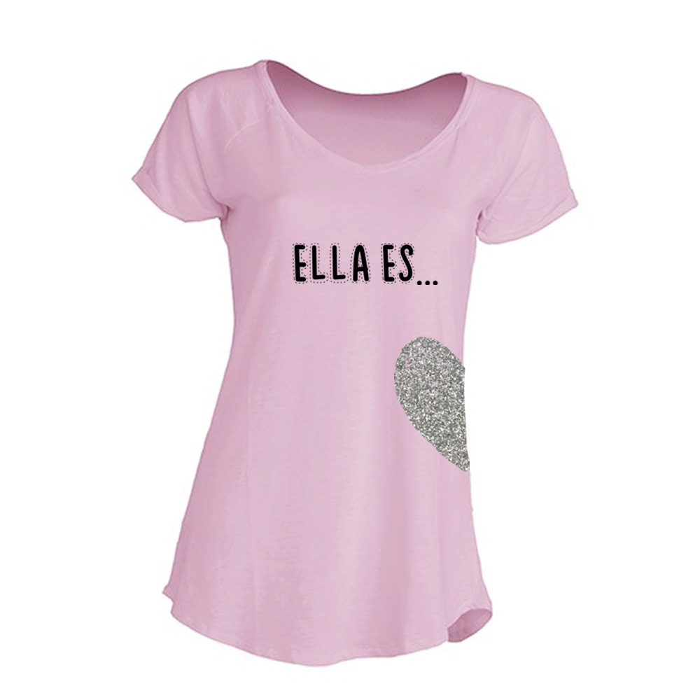 Camiseta para la Mamá de color Rosa con medio corazón en color plata con el mensaje “Ella es…”que hace juego con la camiseta de la Niña “Mi Mitad” y el otro medio corazón que al juntarse con la Niña forman un corazón completo con la frase Ella es… mi Mitad (la camiseta de la niña se vende aparte).