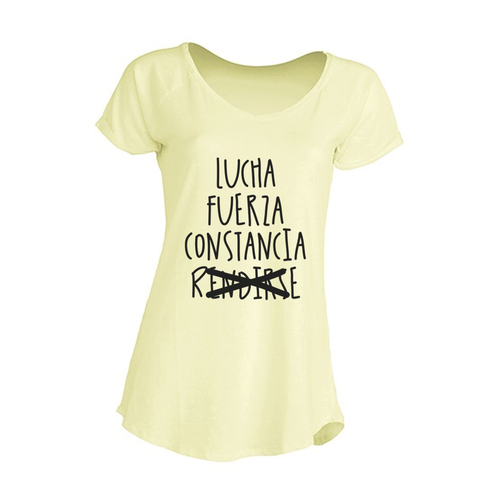 Camiseta de mujer de color amarillo claro con el mensaje “Lucha, Fuerza, Constancia, Rendirse (NUNCA)” en color negro.