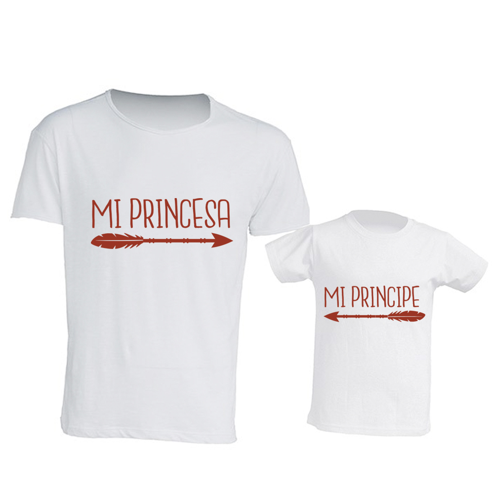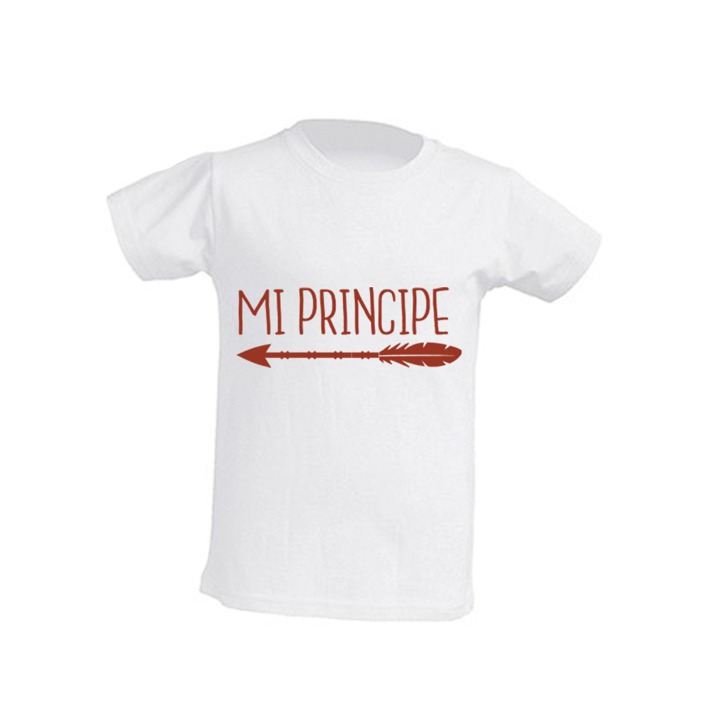 Camiseta para la Niña de color blanco con el mensaje y flecha en rojo indicando hacia la derecha con el mensaje “Mi Príncipe” que hace juego con la camiseta de Papá en los mismos colores y flecha hacia la izquierda indicando hacia el papá “Mi Princesa”. (La camiseta de papá se vende aparte).