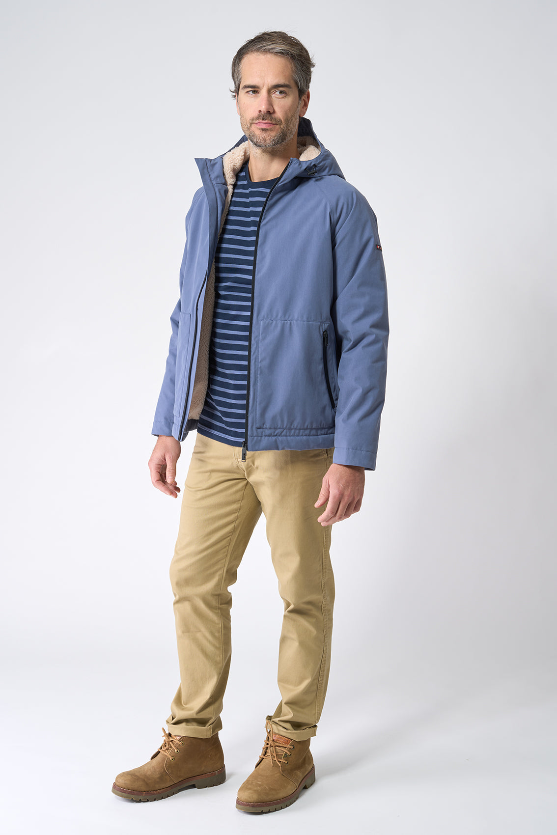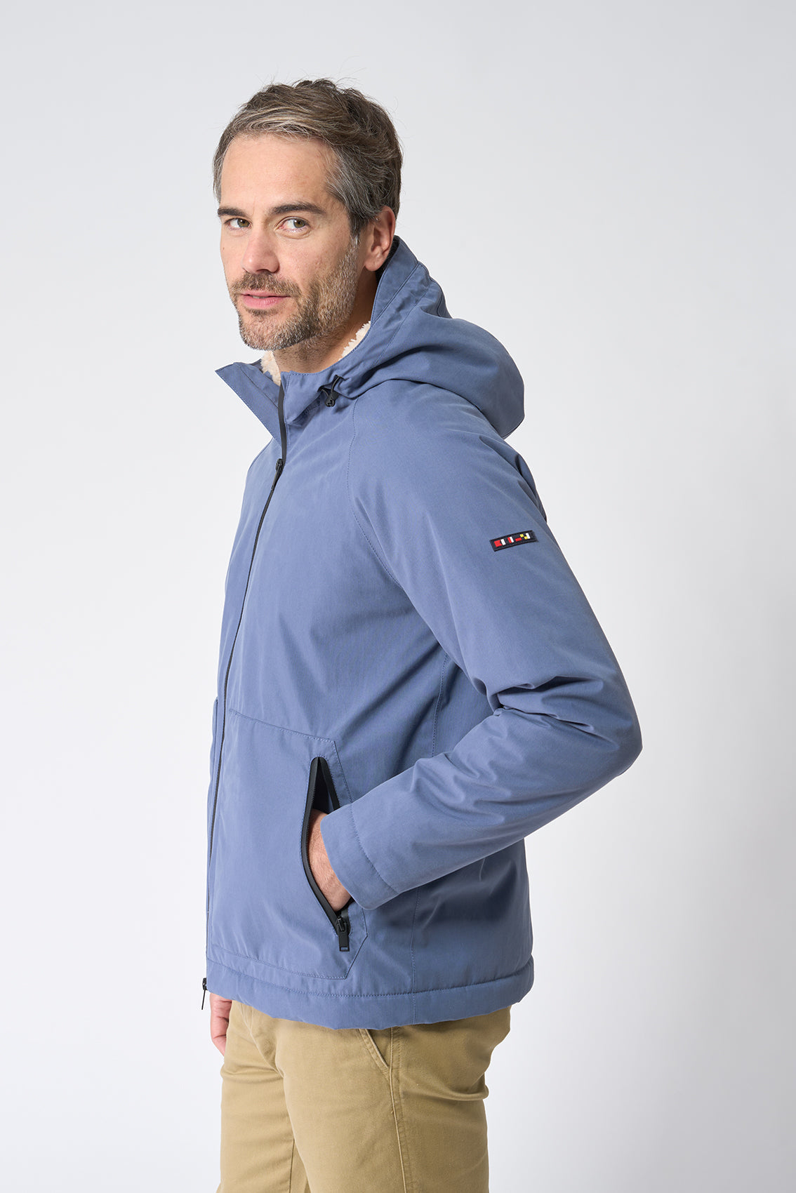 Cazadora de hombre confeccionada en algodón 100% impermeable, perfecta para protegerte de la lluvia sin renunciar al estilo. Incorpora un forro interior de borreguito, que aporta abrigo y confort en los días fríos. El cierre frontal con cremallera de doble cursor impermeable garantiza un sellado eficaz contra la humedad, y los bolsillos laterales añaden funcionalidad sin romper la estética limpia de la prenda. Una opción práctica y cálida con un diseño clásico y duradero. La modelo mide 1,83m y lleva una talla M.