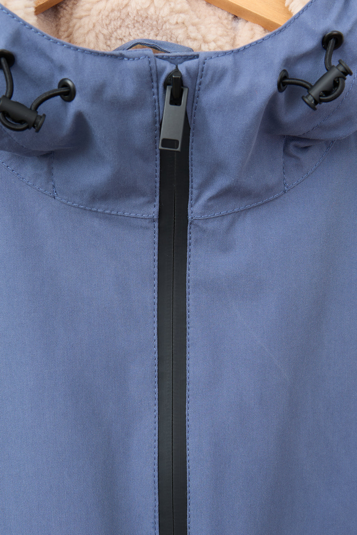 - Capucha con cordón ajustable, cuello alto y mangas raglán.