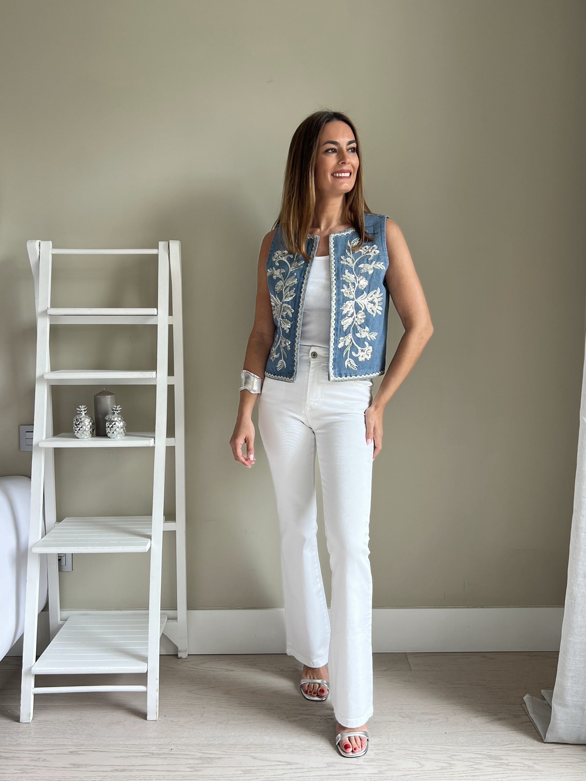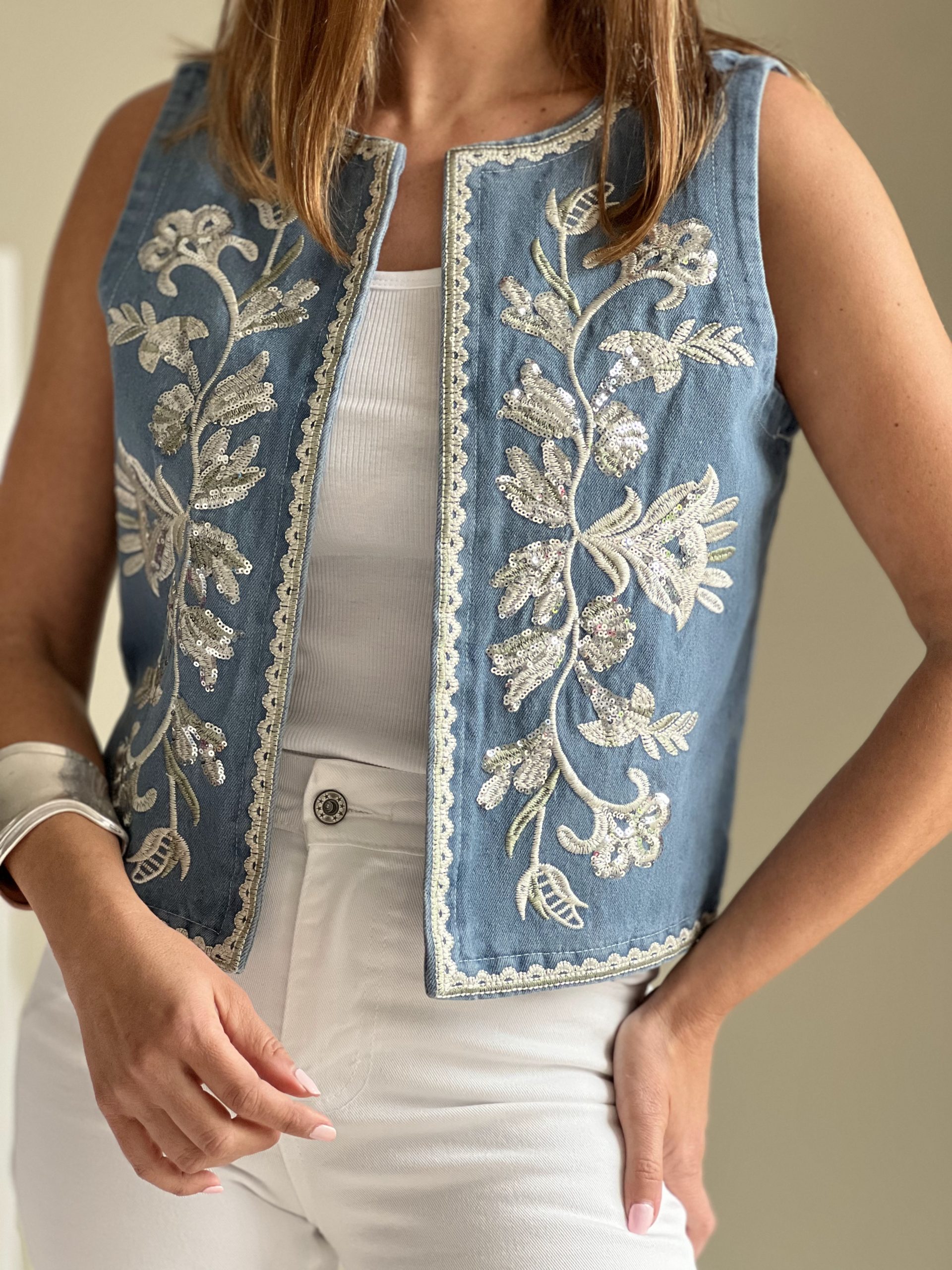 Chaleco denim bordado en tonos plateados y dorados. Espalda lisa.