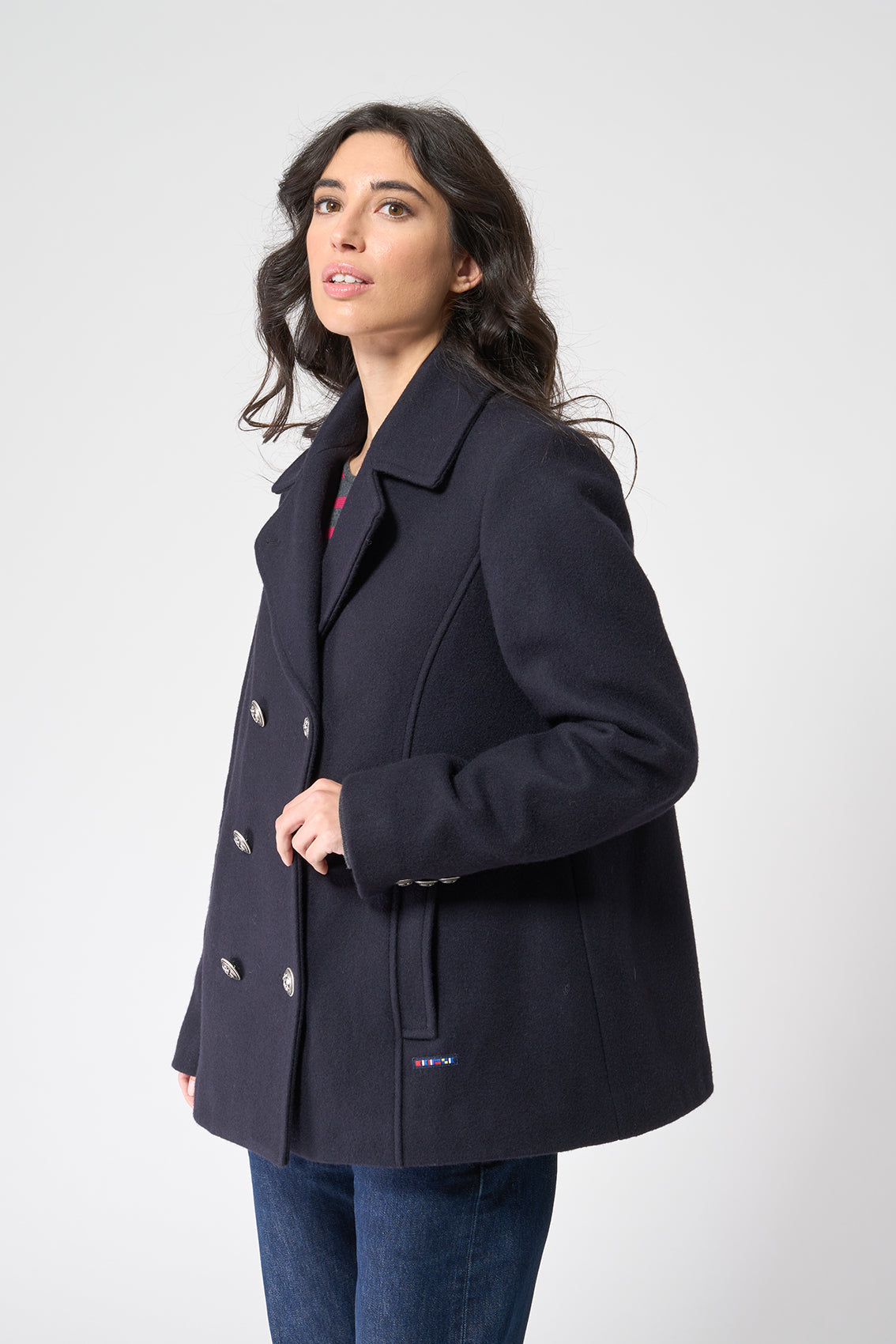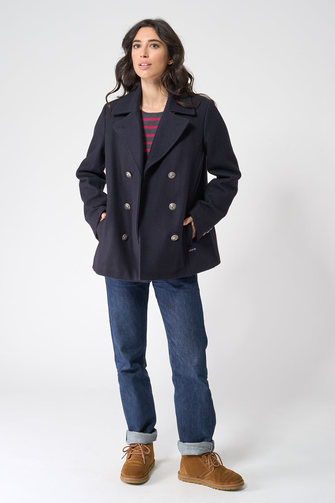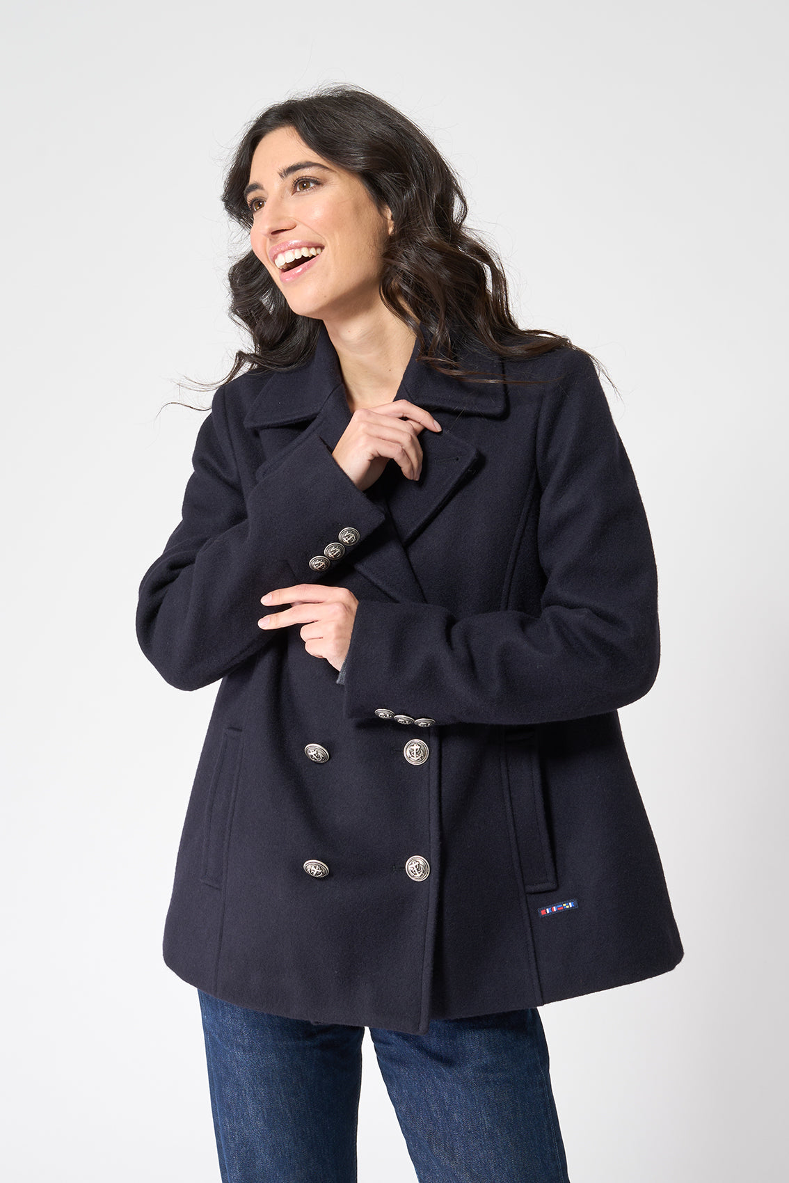 Abrigo o chaquetón clásico marinero para mujer confeccionado en lana. Un clásico de nuestra marca y una prenda que nunca pasa de moda en un look marinero. El chaquetón cuenta con cuello sastre y dos bolsillos laterales. Su doble botonadura con elegantes botones de anclas, y los botones en los puños, le dan el auténtico look marinero a la prenda. La modelo mide 1,72m y lleva una talla 38.