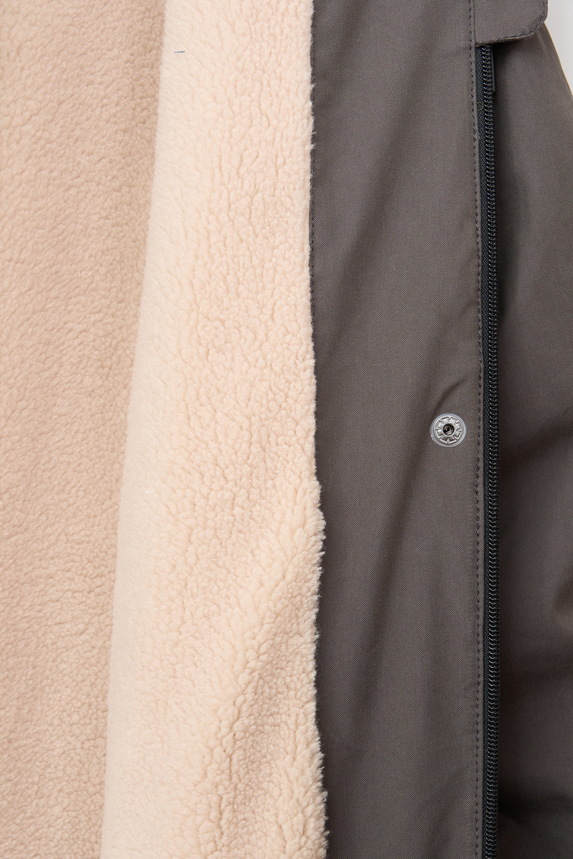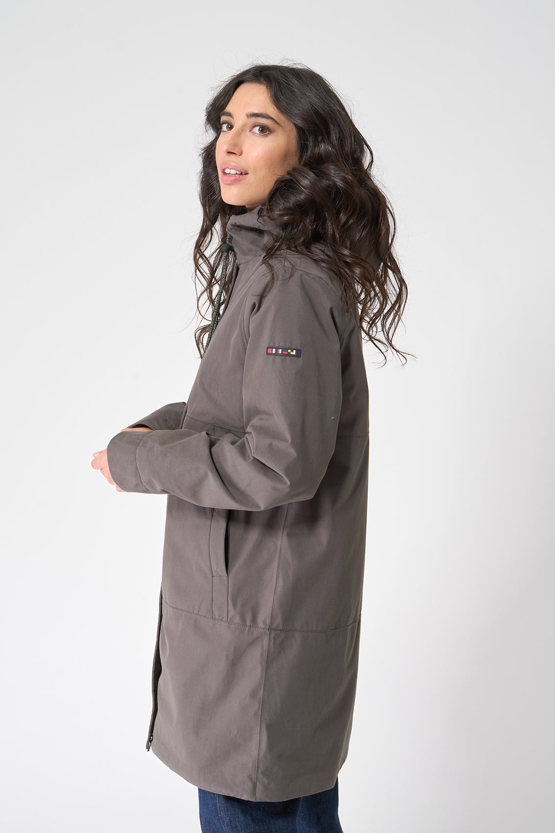 Abrigo de mujer 100% impermeable con capucha y forro interior de borreguito. Cierre frontal con cremallera de doble cursor, que se oculta con una tapeta cerrada con corchetes. Esta es una prenda exterior perfecta para usarla tanto como abrigo, como para la lluvia. La modelo mide 1,72m y lleva una talla 38