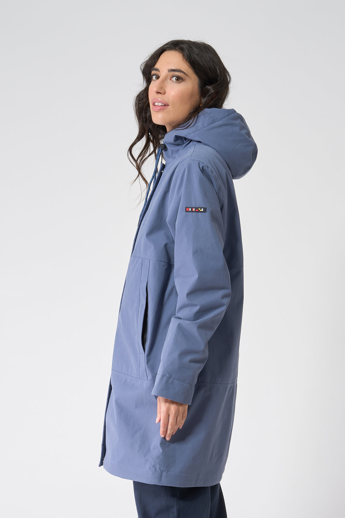 Abrigo de mujer 100% impermeable con capucha y forro interior de borreguito. Cierre frontal con cremallera de doble cursor, que se oculta con una tapeta cerrada con corchetes. Esta es una prenda exterior perfecta para usarla tanto como abrigo, como para la lluvia. La modelo mide 1,72m y lleva una talla 38