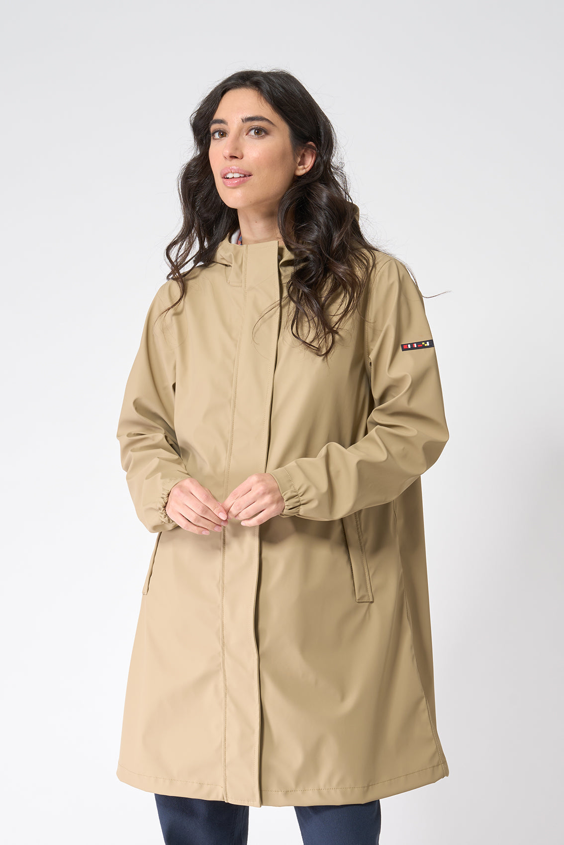 Abrigo de mujer 100% impermeable con capucha y forro interior de borreguito. Cierre frontal con cremallera de doble cursor, que se oculta con una tapeta cerrada con corchetes. Esta es una prenda exterior perfecta para usarla tanto como abrigo, como para la lluvia. La modelo mide 1,72m y lleva una talla 38