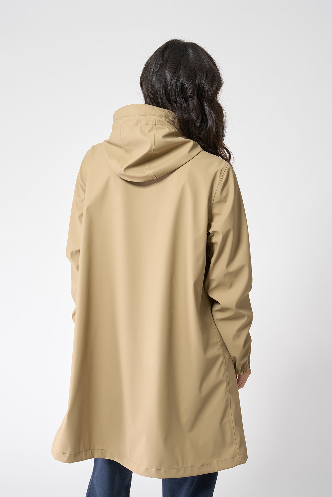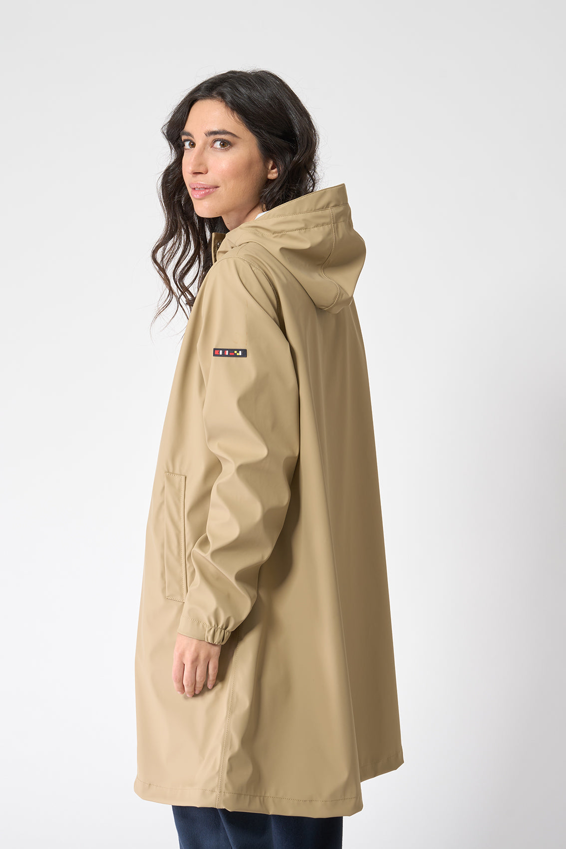 Chubasquero de entretiempo para mujer, confeccionado en tejido impermeable de poliuretano, ideal para protegerte de la lluvia y el viento durante los días templados de otoño. Diseño ligero sin forro interior, que permite una mayor transpirabilidad y facilidad de movimiento. Cuenta con cierre frontal de cremallera oculta bajo tapeta con corchetes, que refuerza la protección frente a la humedad. Incorpora una capucha ajustable, puños con acabado elástico y bolsillos laterales funcionales. Su acabado mate y minimalista lo convierte en una prenda versátil, perfecta tanto para looks urbanos como para escapadas al aire libre. La modelo mide 1,72m y lleva una talla 38.