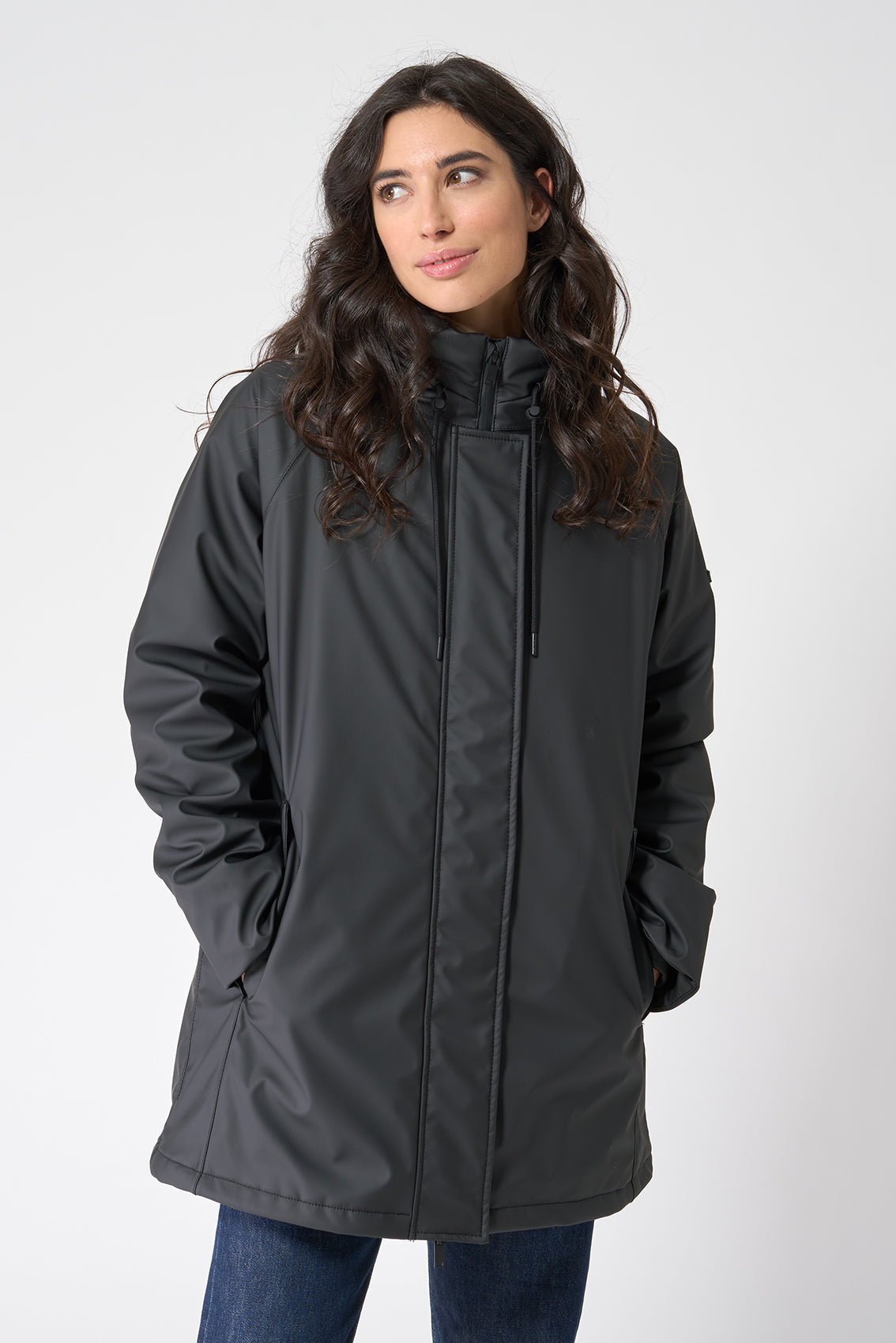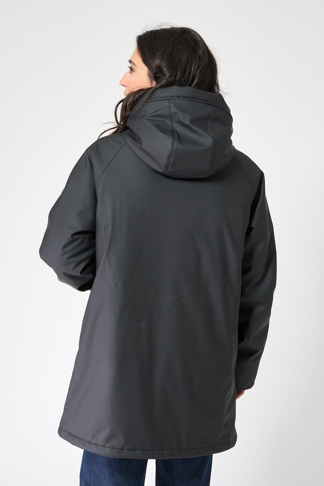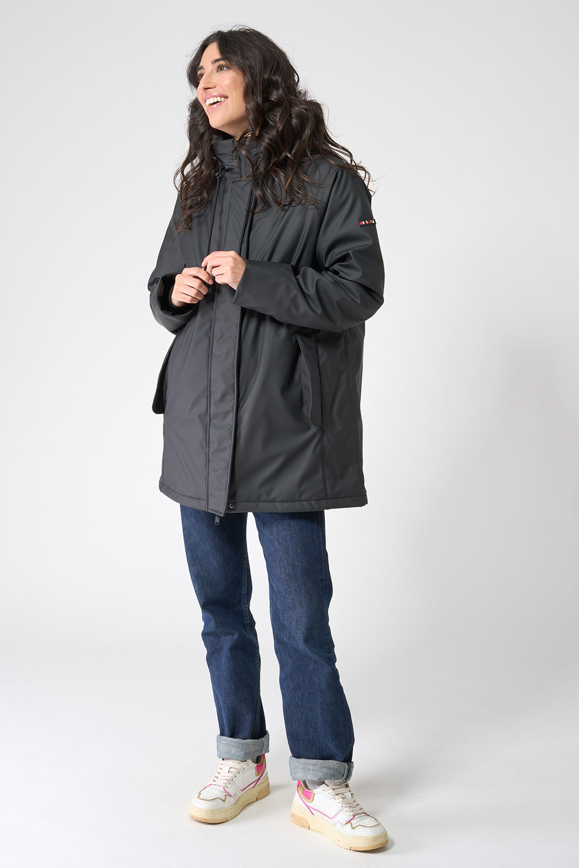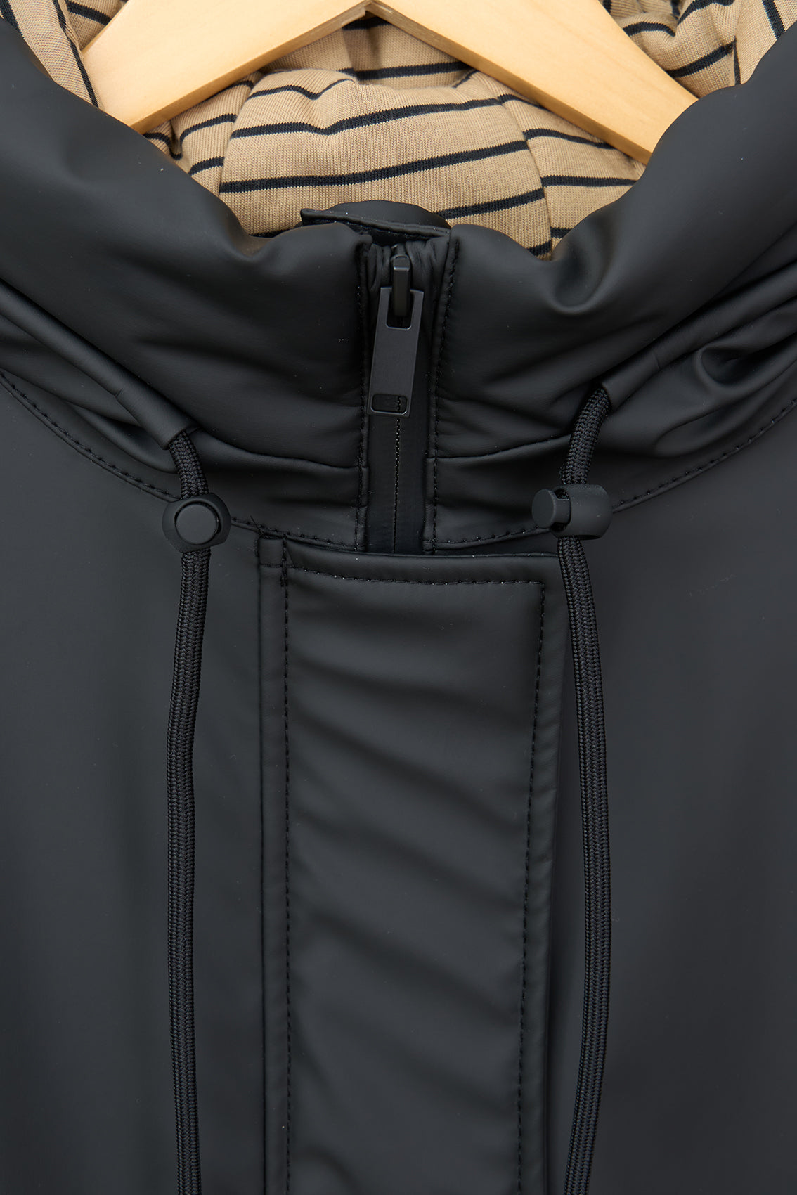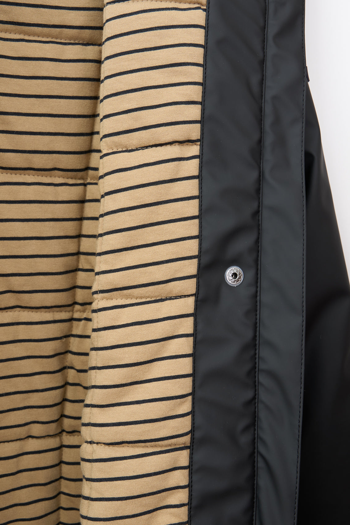 Chubasquero en confeccionado en nuestro icónico tejido de poliuretano que ofrece una impermeabilización total gracias a las costuras selladas. Resistente al viento y aislante al frío gracias al interior de fibras de poliéster entrelazadas. El interior lo tiene forrado de algodón con un estapado de rayas a juego con el color del chubasquero. La modelo mide 1,72m y lleva una talla 38.