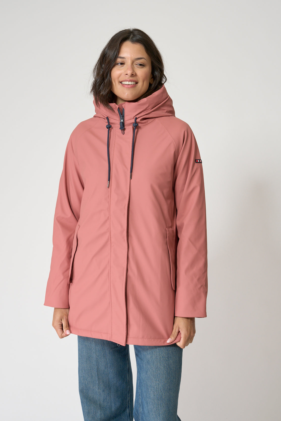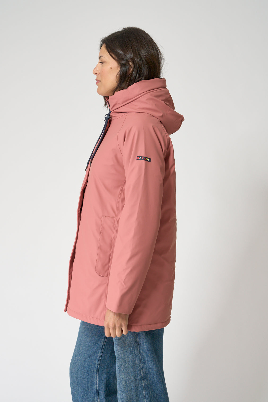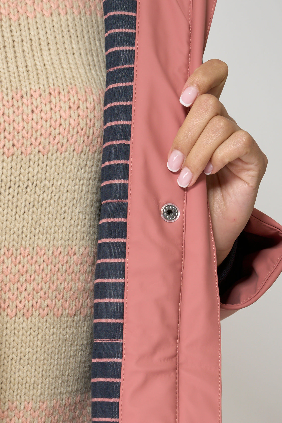 Chubasquero en confeccionado en nuestro icónico tejido de poliuretano que ofrece una impermeabilización total gracias a las costuras selladas. Resistente al viento y aislante al frío gracias al interior de fibras de poliéster entrelazadas. El interior lo tiene forrado de algodón con un estapado de rayas a juego con el color del chubasquero. La modelo mide 1,72m y lleva una talla 38.