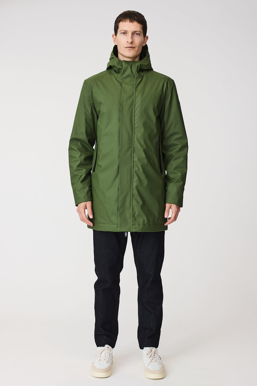 - Capucha ajustable con cordón, visera integrada y cuello alto.