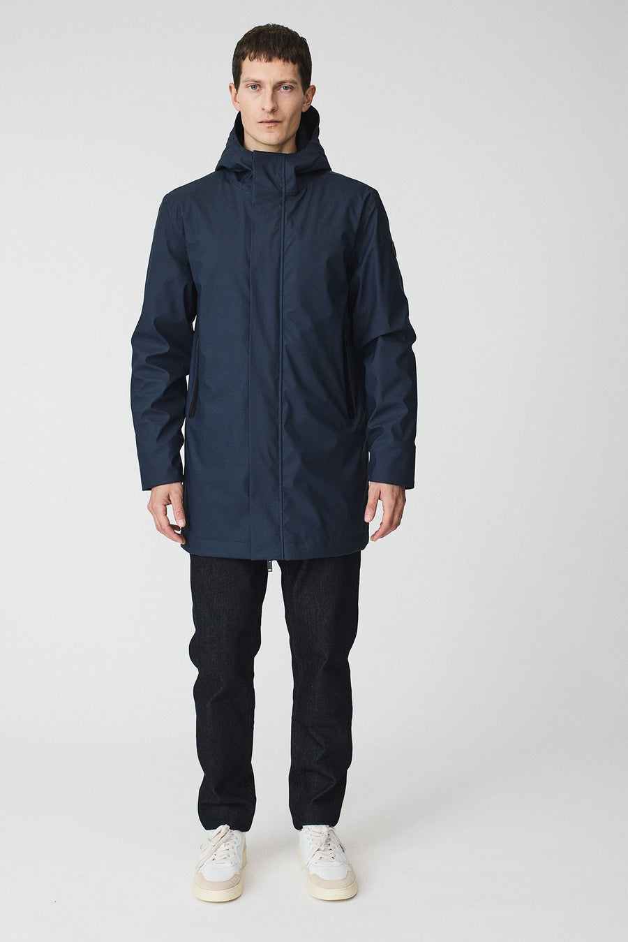 - Capucha ajustable con cordón, visera integrada y cuello alto.
