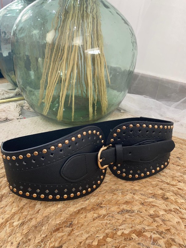 Cinturón de polipiel negra con detalle de tachas doradas.