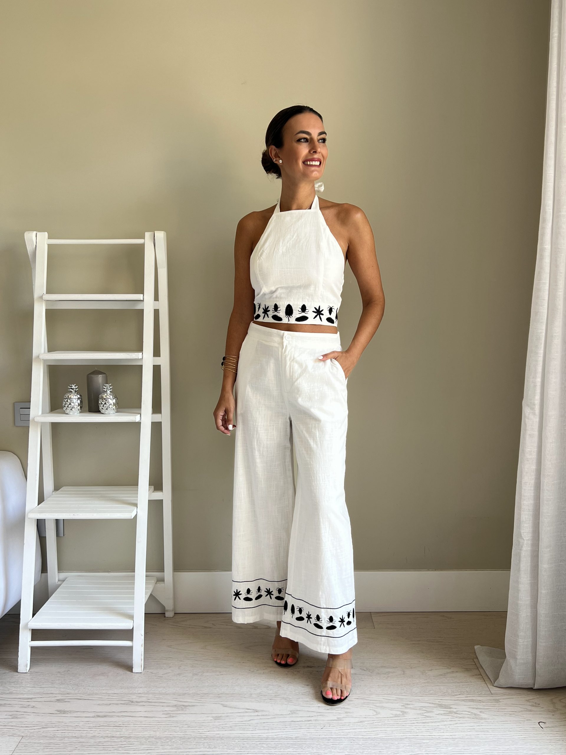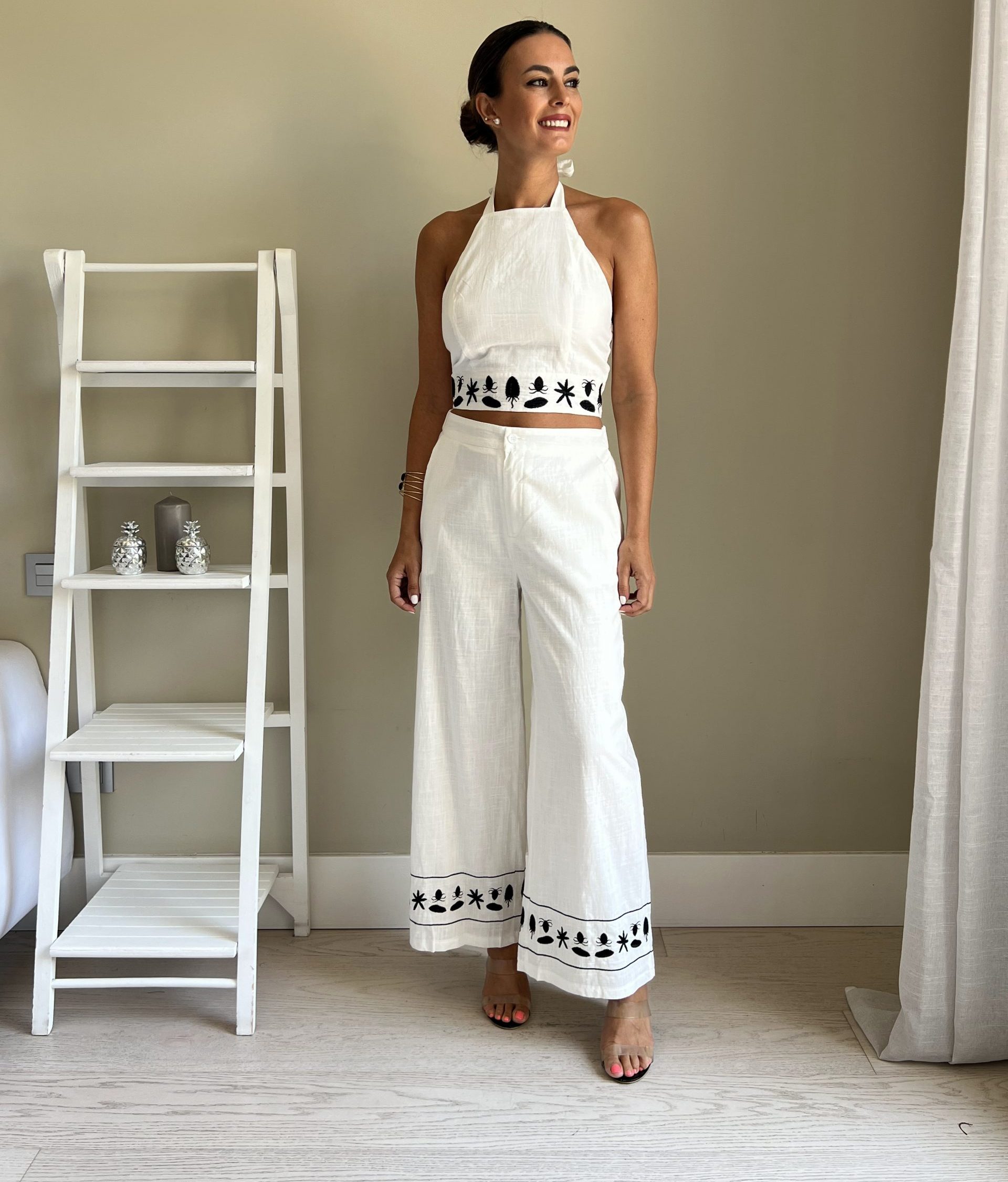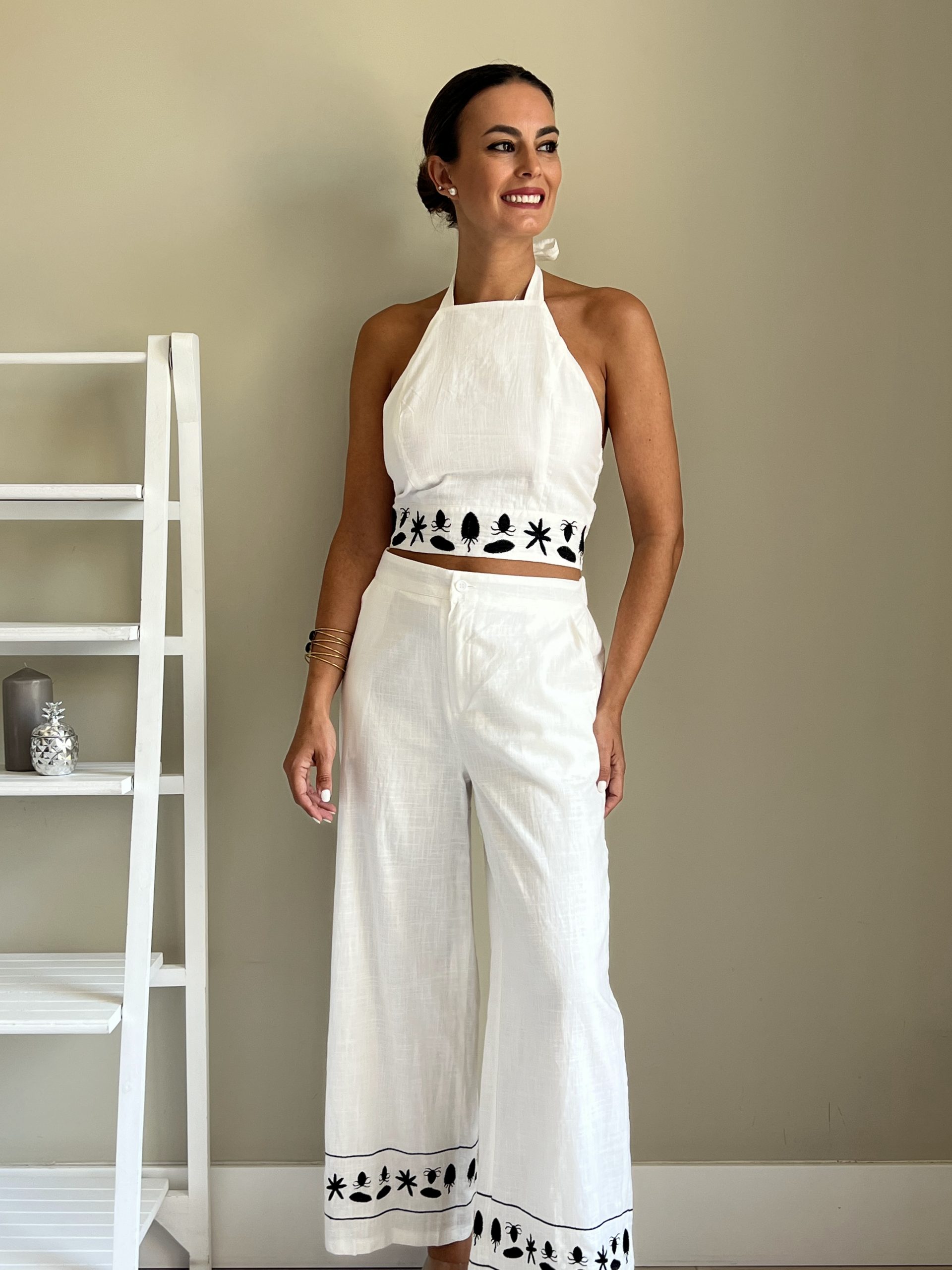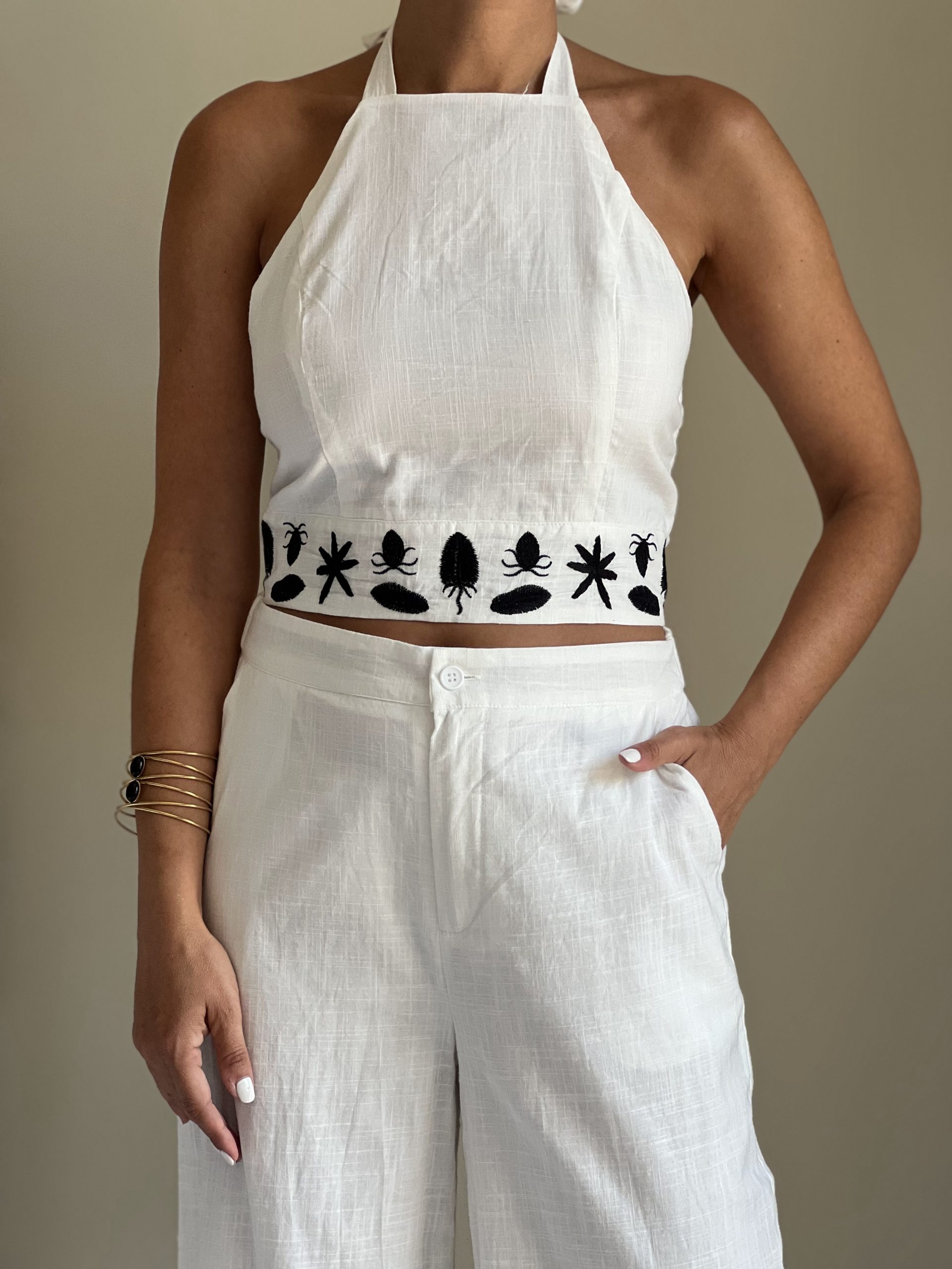 Conjunto de lino blanco con bordados en negro. Pantalón con bolsillos laterales y top halter con espalda elástica de nido de abeja. Top y pantalón vienen con forro.
