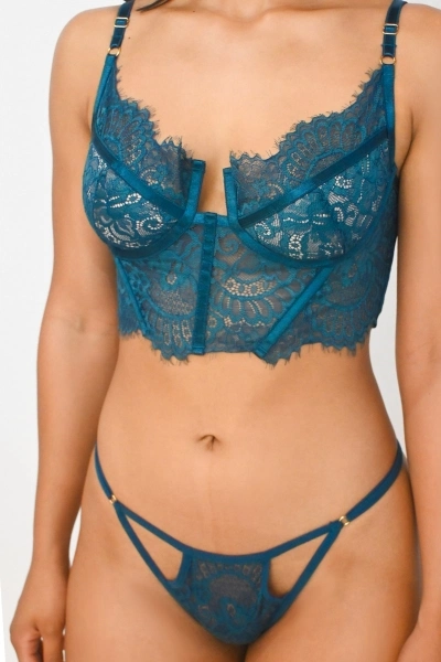 Llegó el momento de brillar aún más con el Conjunto Gabriela color Verde Jade. Si, el encaje es para dejarlo ver y utilizarlo como ropa exterior. Este elegante y cómodo BUSTIER posee forro interno, sin transparencias en la zona de los senos, acompañado con una sexy tanga a juego con diseño minimalista. Conjunto perfecto para cualquier ocasión donde quieras destacar o para una velada nocturna especial.
