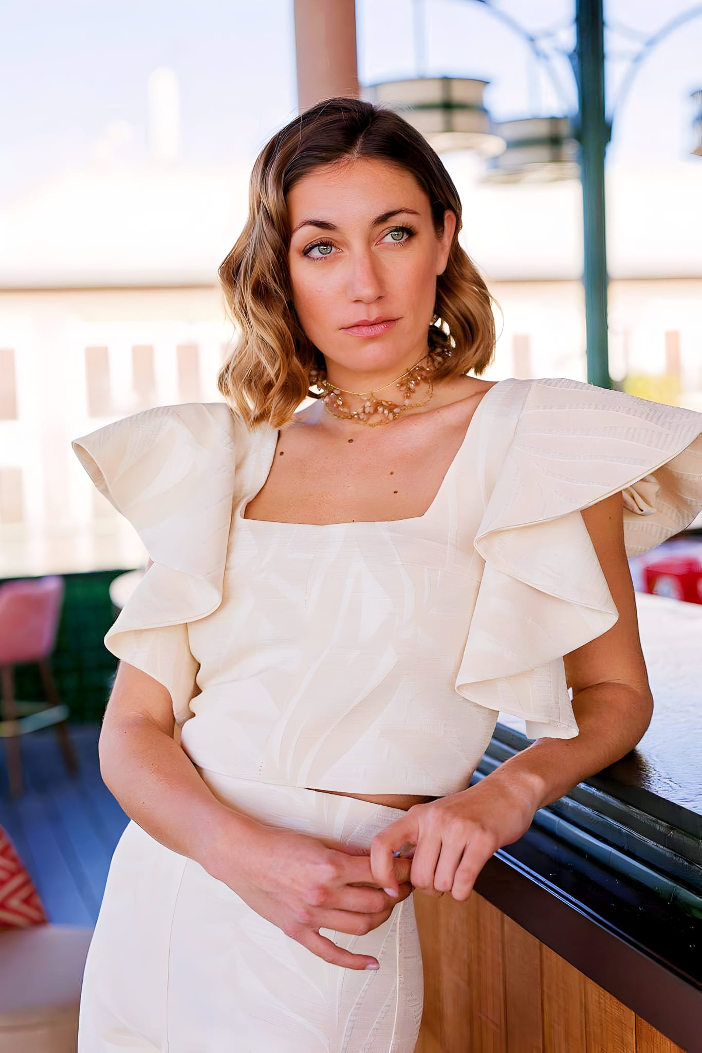 Top a la cintura, con escote cuadrado y manga a la sisa con gran volante en ambos hombros.