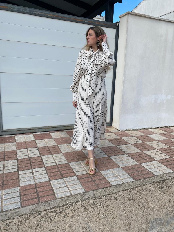 Conjunto de tejido suelto y fluido compuesto de camisa y falda en color blanco tostado y topitos negros. Ideal para tus eventos, ferias o con looks por separado.
