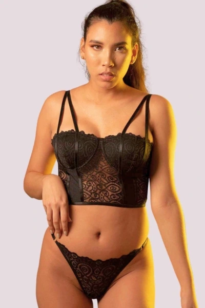 Si deseas una inolvidable noche con tu pareja, este conjunto NEGRO es la mejor elección. Mostrará toda tu feminidad. Este elegante CORSET diseñado en encaje y herrajes bañados en oro, resaltá tus perfectas curvas. Posee varillas y forro interno, para que no se transparente tus senos y lo utilices como prenda exterior. Lo puedes usar con la BLUSA CARLOTA, con una blusa con escote profundo o con una tercera prenda. Tiene unos sexys detalles de tiras en el pecho. Incluye su panty tipo HILO.