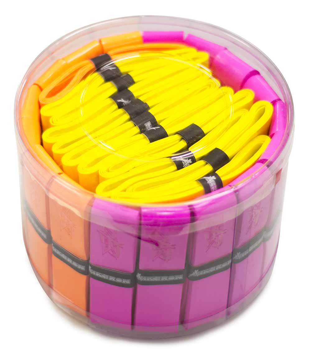 Cubo de Overgrips con 60 unidades en diferentes colores. Los colores son Amarillo, Verde fluor, Naranja fluor, Rosa fluor, Morado, y Negro.