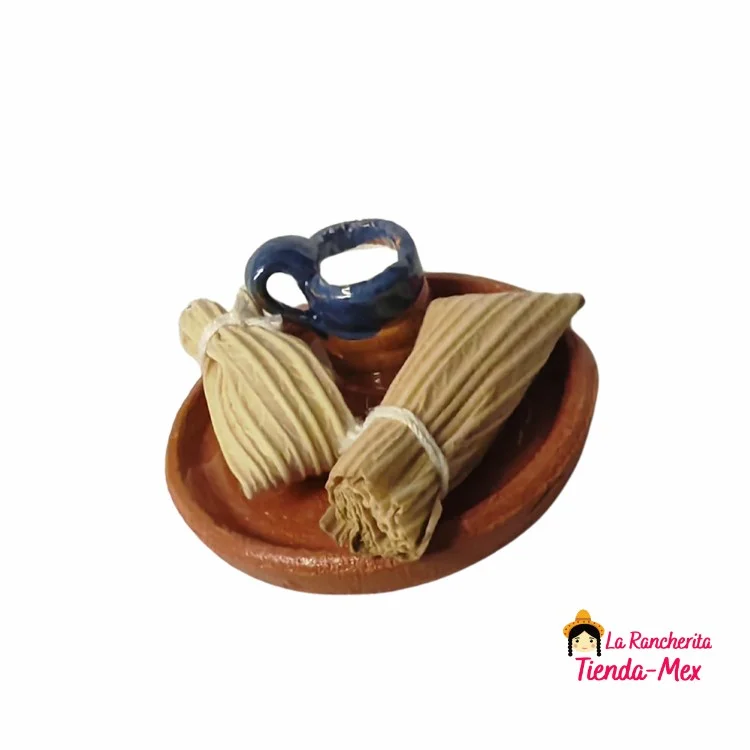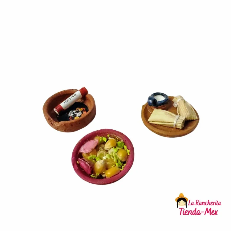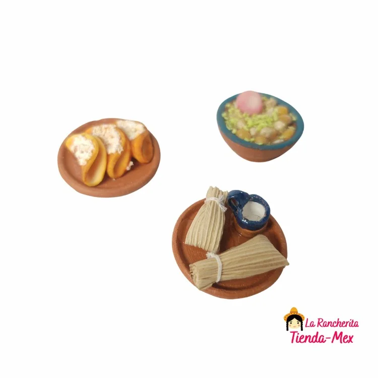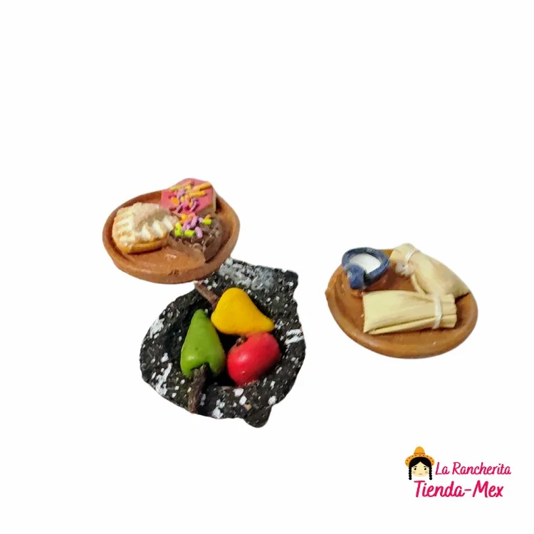 Pequeña figura decorativa hecha a mano que representa platillos típicos de la gastronomía mexicana, como tacos, sopes, tamales, enchiladas, entre otros. Elaborada con materiales ligeros y pintada a mano, es ideal como adorno, recuerdo o detalle temático para tiendas de souvenirs o artículos culturales.