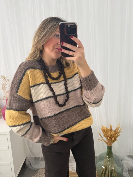 Jersey estilo amplio de punto grueso con un 8% de lana con estampado de rayas de colores marrones y mostaza.