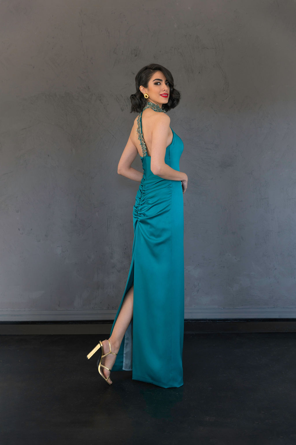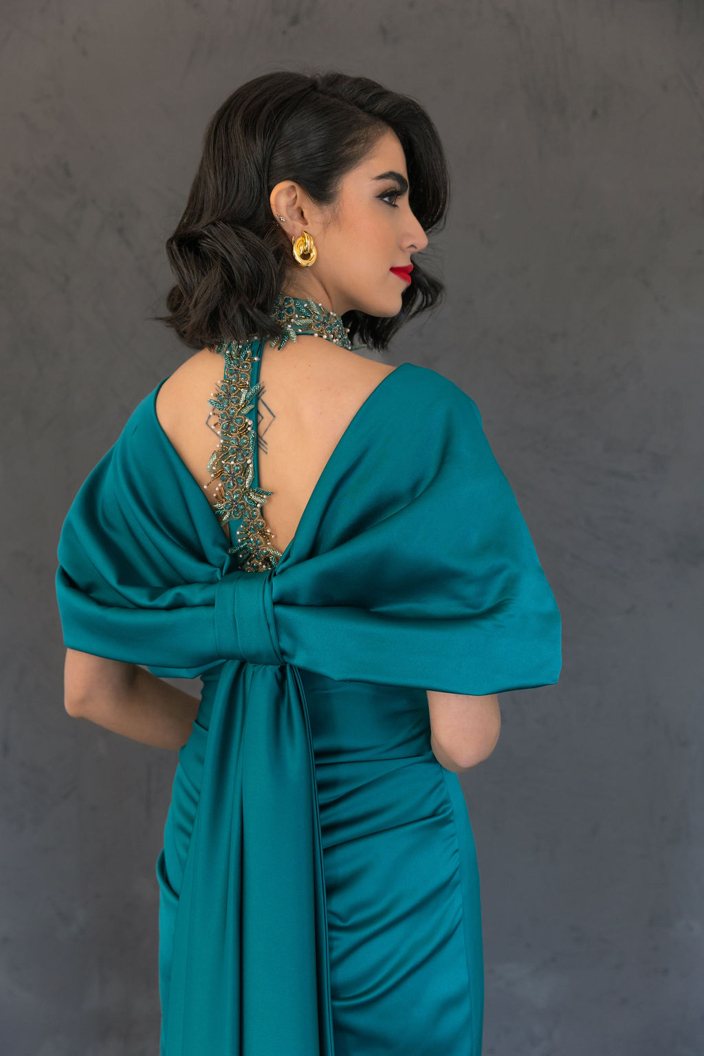 Vestido verde cogido al cuello con chal.