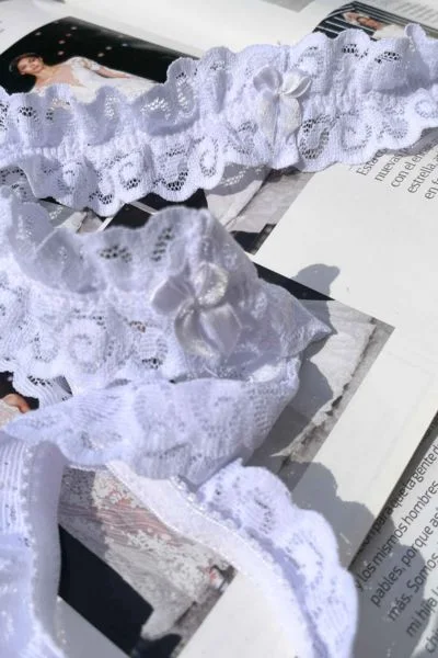 Hermosa y elegante liga de encaje, con lindo detalle en forma de lazo. Ideal para utilizarlo como accesorio para ese día tan especial. Su resistente elástico hará que se adapte de la forma más sexy a tus piernas. La liga DANNA es la perfecta para tu noche de bodas o fiesta de matrimonio.