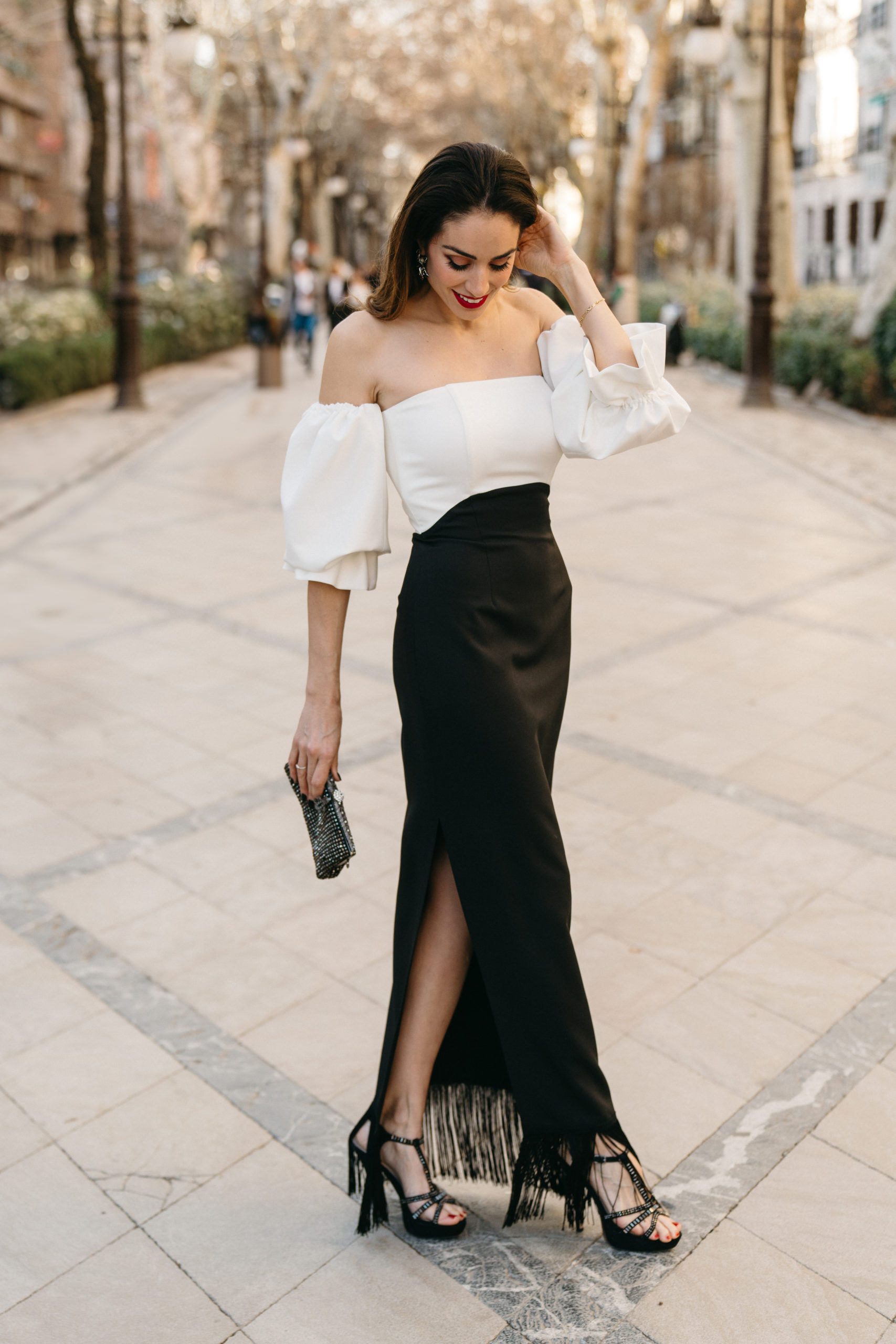 Lucrecia es un vestido elegante en blanco y negro confeccionado en crepé que tiene un escote de palabra de honor. Sus mangas abullonadas, de quita y pone, añaden un toque de versatilidad y encanto. La falda de largura al tobillo tiene una sutil raja en el lateral y añade un toque de intriga, revelando un destello de piel con cada paso.