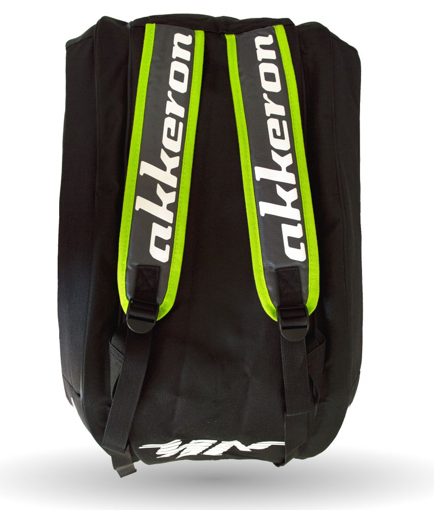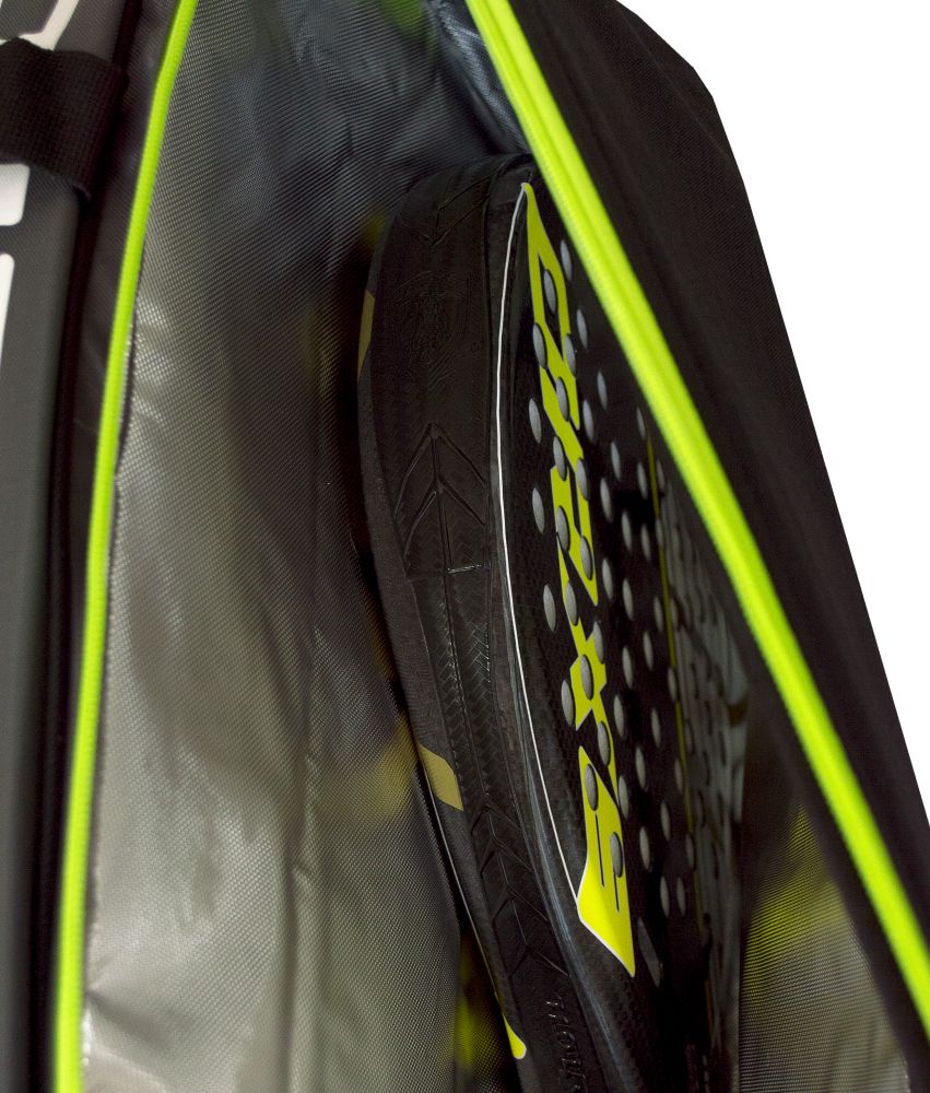 Consta de tres compartimentos, uno de ellos térmico, dos bolsillos laterales, y bolsa porta zapatillas aparte. Para el transporte tiene dos correas para la espalda y un asa de mano.