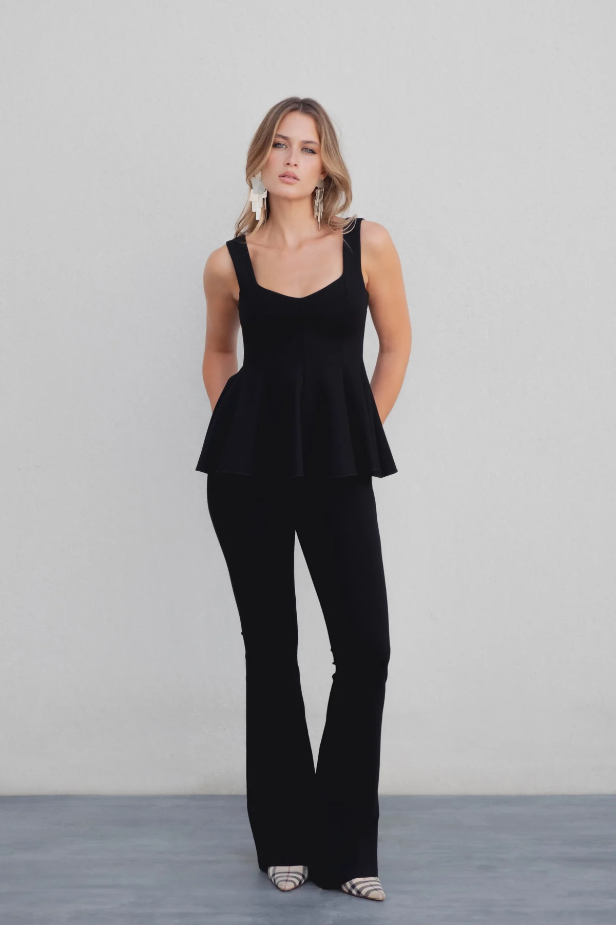 Pantalón confeccionado en tejido elástico. Tiro alto y cintura elástica. Bajo acabado flare.