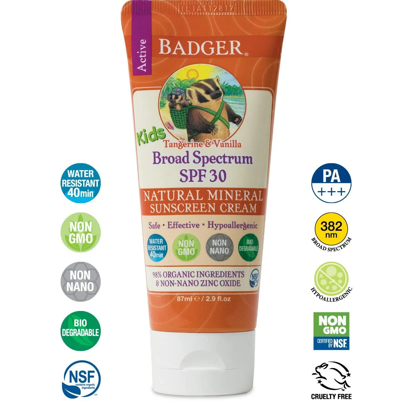 Protector solar orgánico a base de minerales para niños, con mandarina y vainilla.
