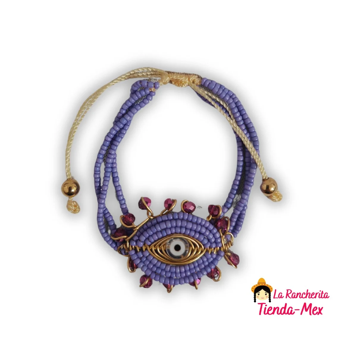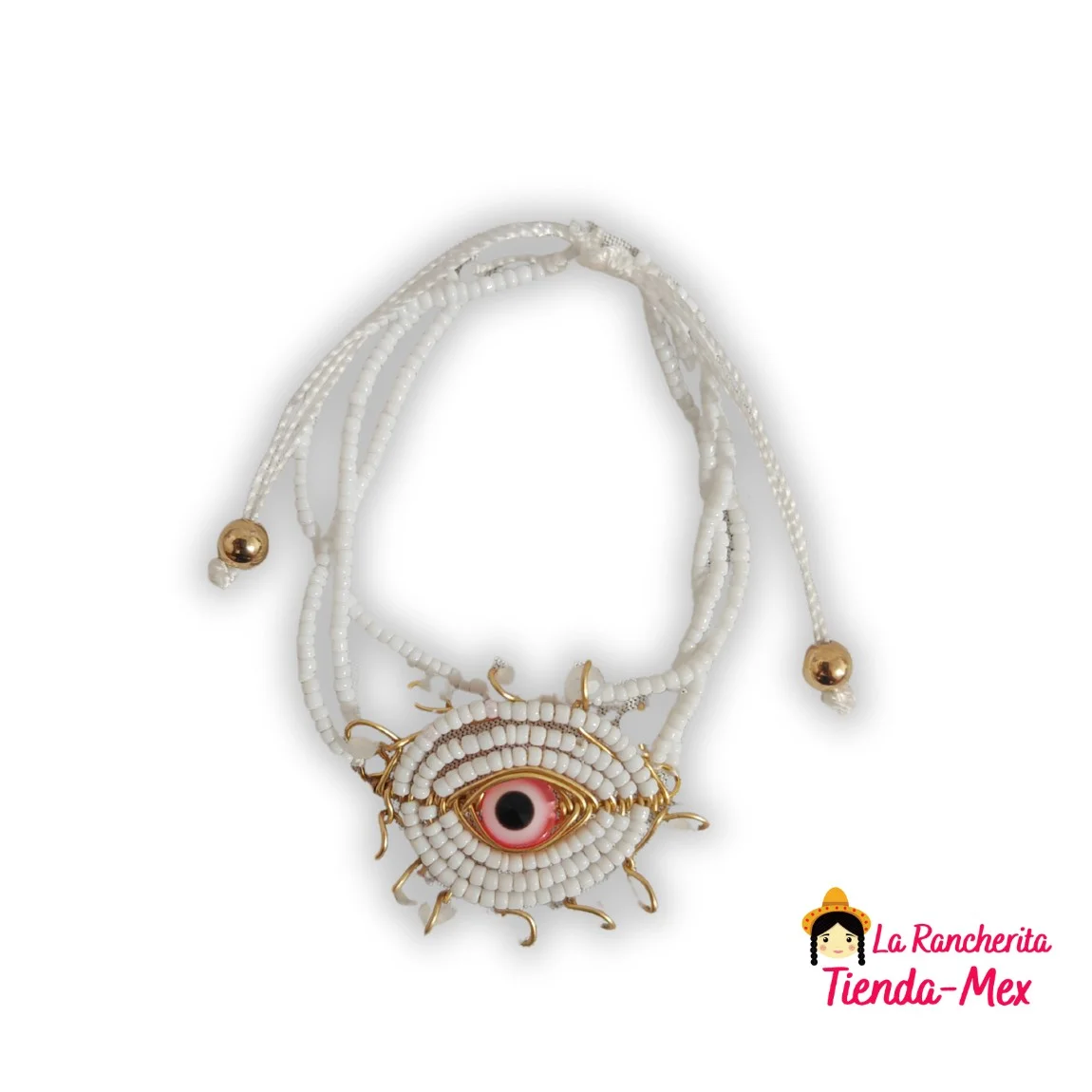 Pulsera artesanal elaborada con hilo resistente y cuentas de chaquira, destacando un dije central de ojo turco. Este diseño combina tradición con elementos de protección simbólica, ideal para pedidos variados de bisutería artesanal.