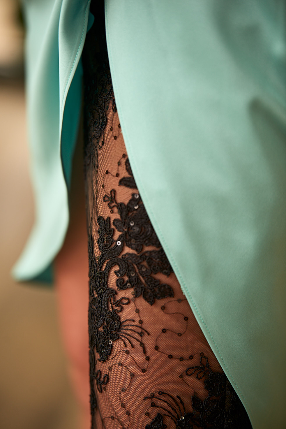Vestido pecho encaje negro con cuerpo y falda cruzados, manga larga.