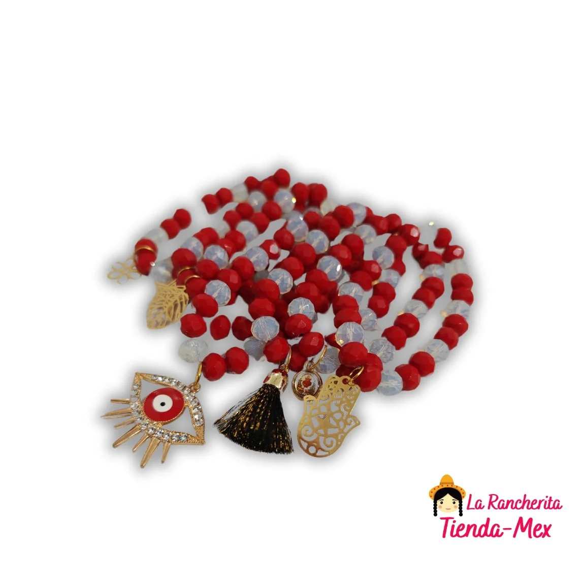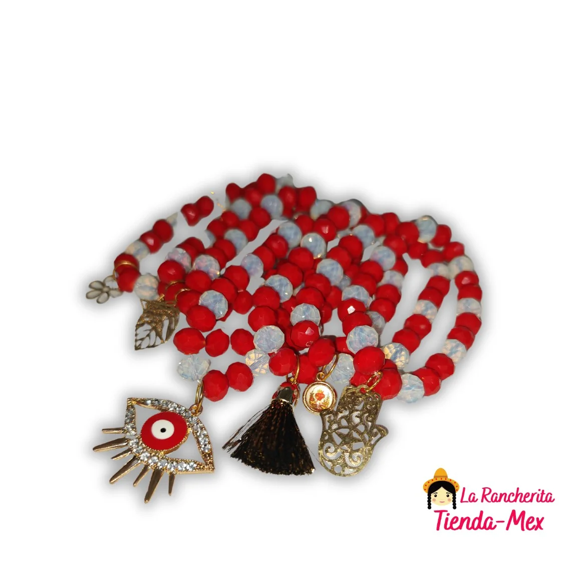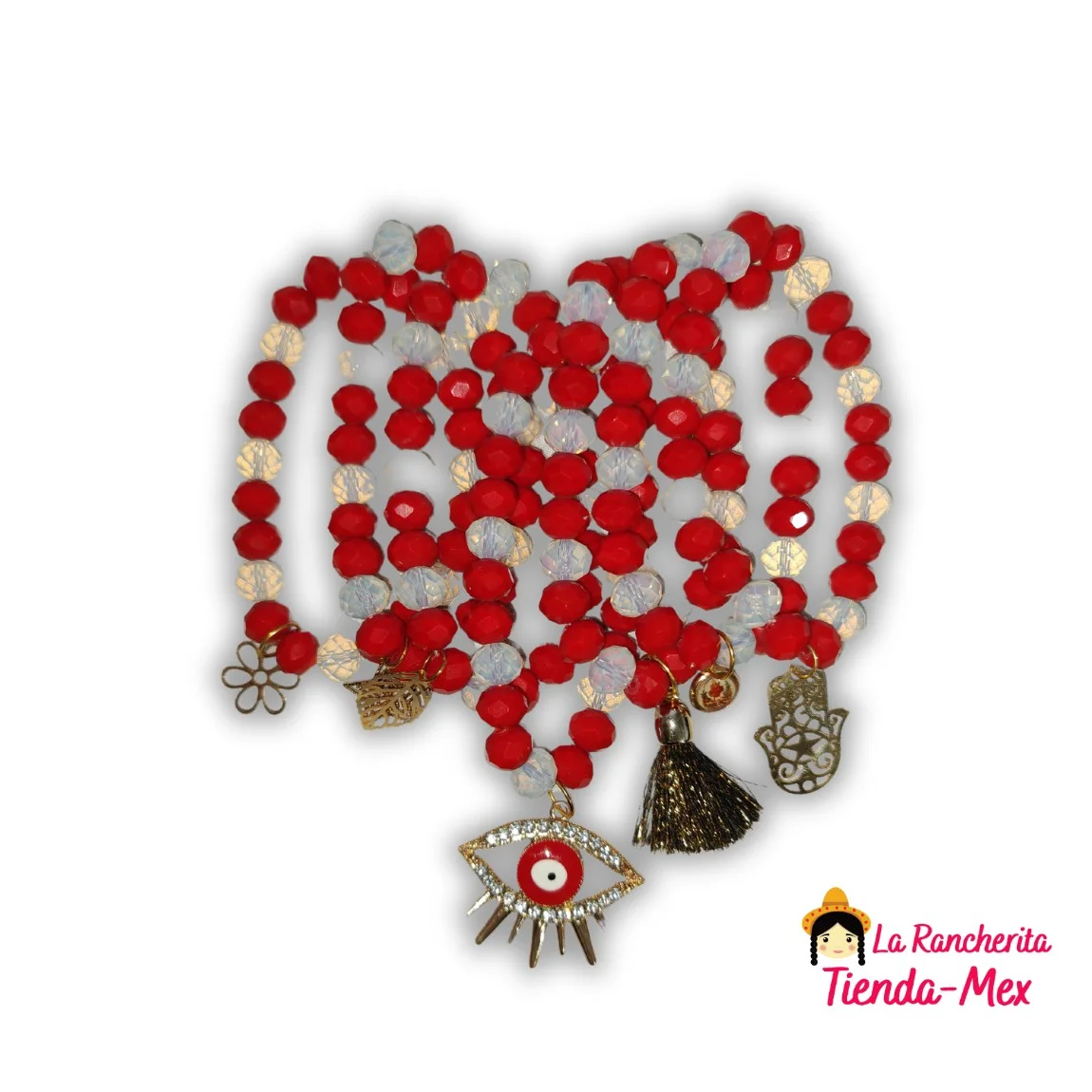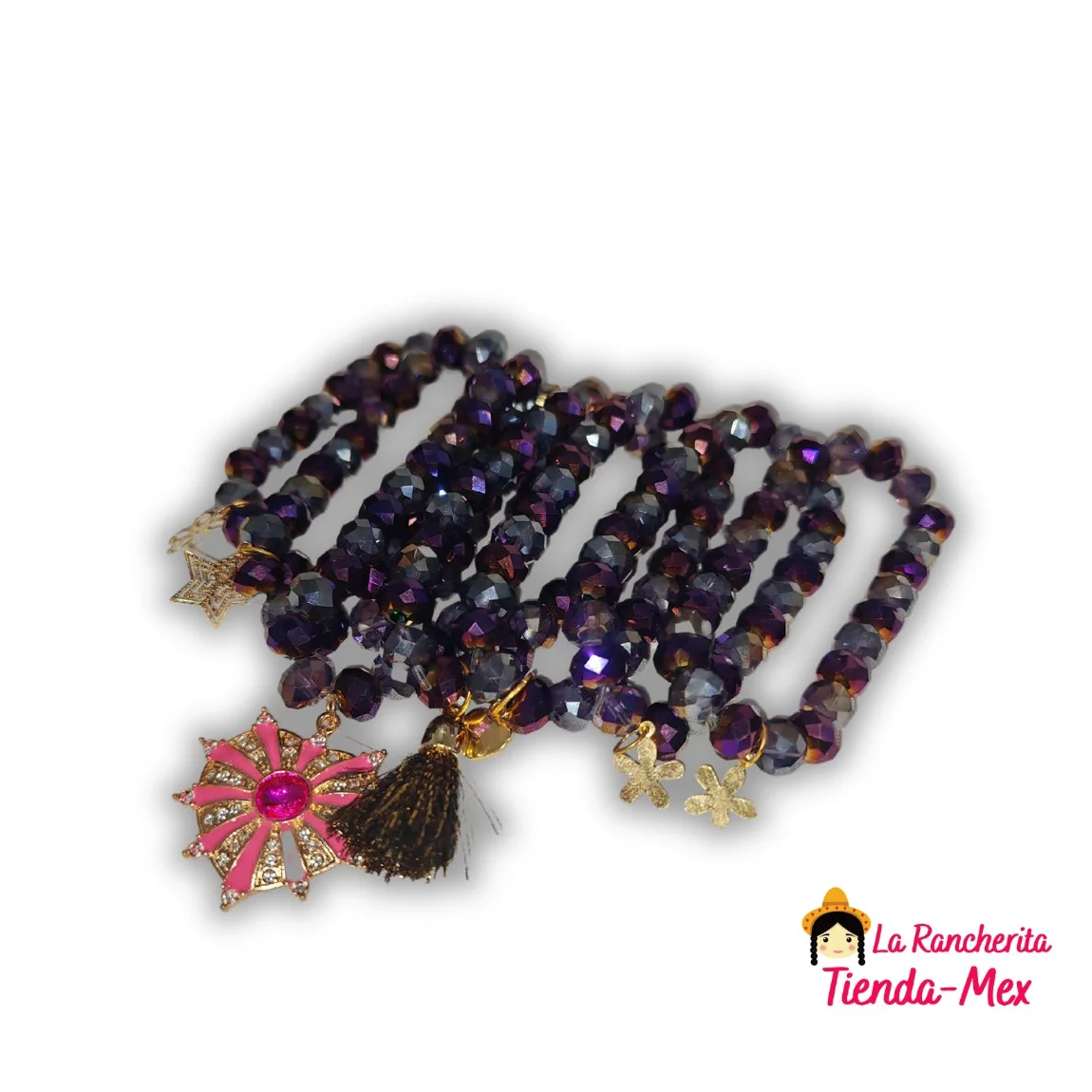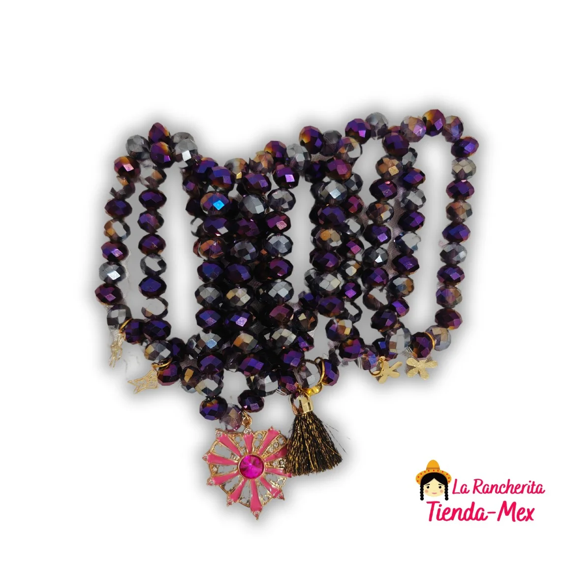 Juego de pulseras tipo semanario elaborado de manera artesanal con cuencas de cristal estilo “buchón”. Diseño sencillo y vistoso, ideal para complementar catálogos de bisutería moderna y accesible.