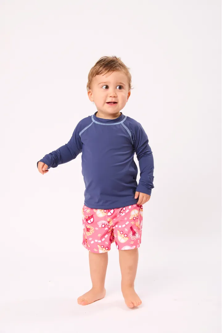 Ropa de baño de niño estilo short con un bolsillo en parte trasera y pitas ajustables en parte delantera. Tela Microtek que cuenta con Tecnología Repel para un rápido secado y protección UPF 50+.