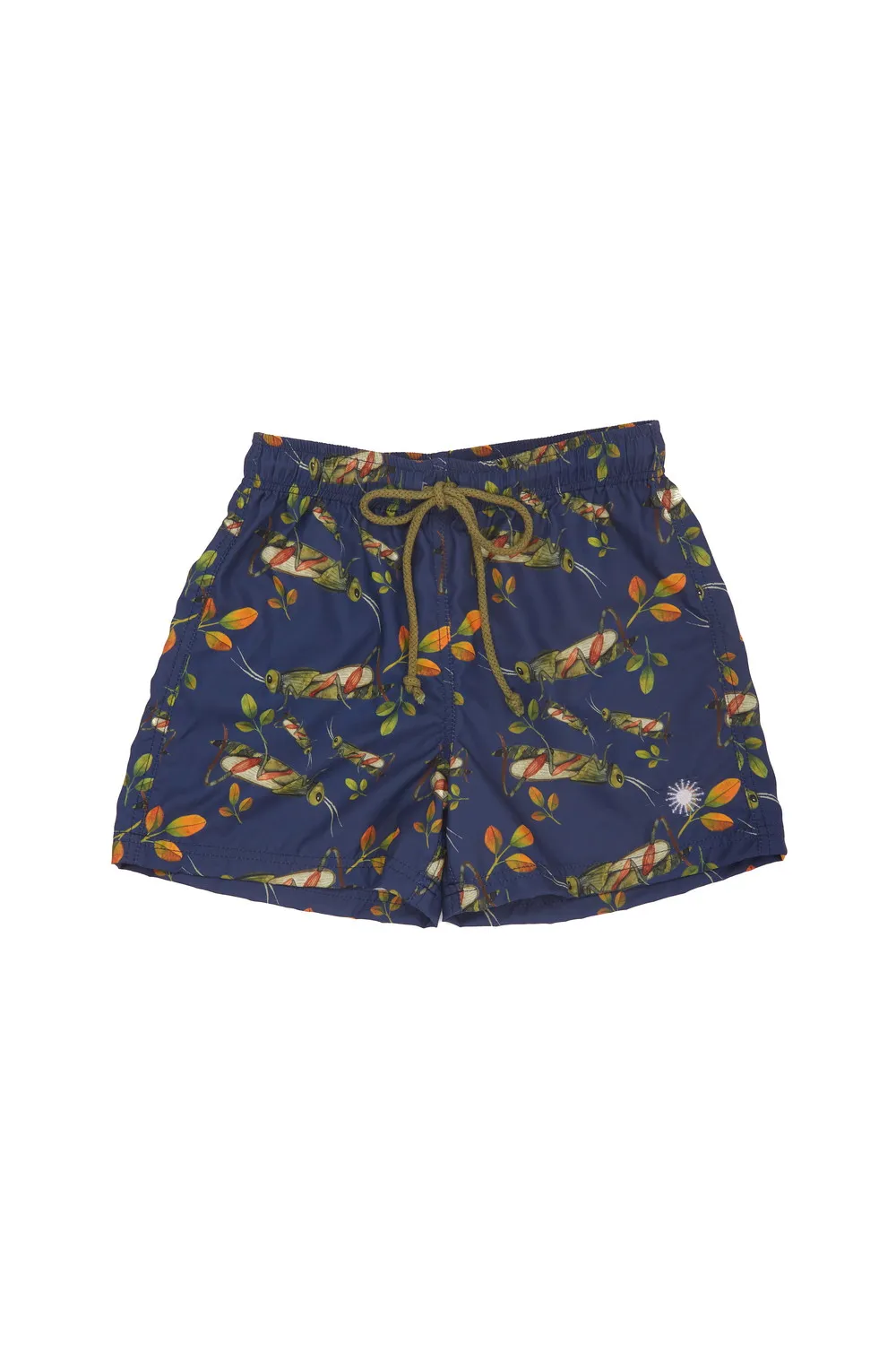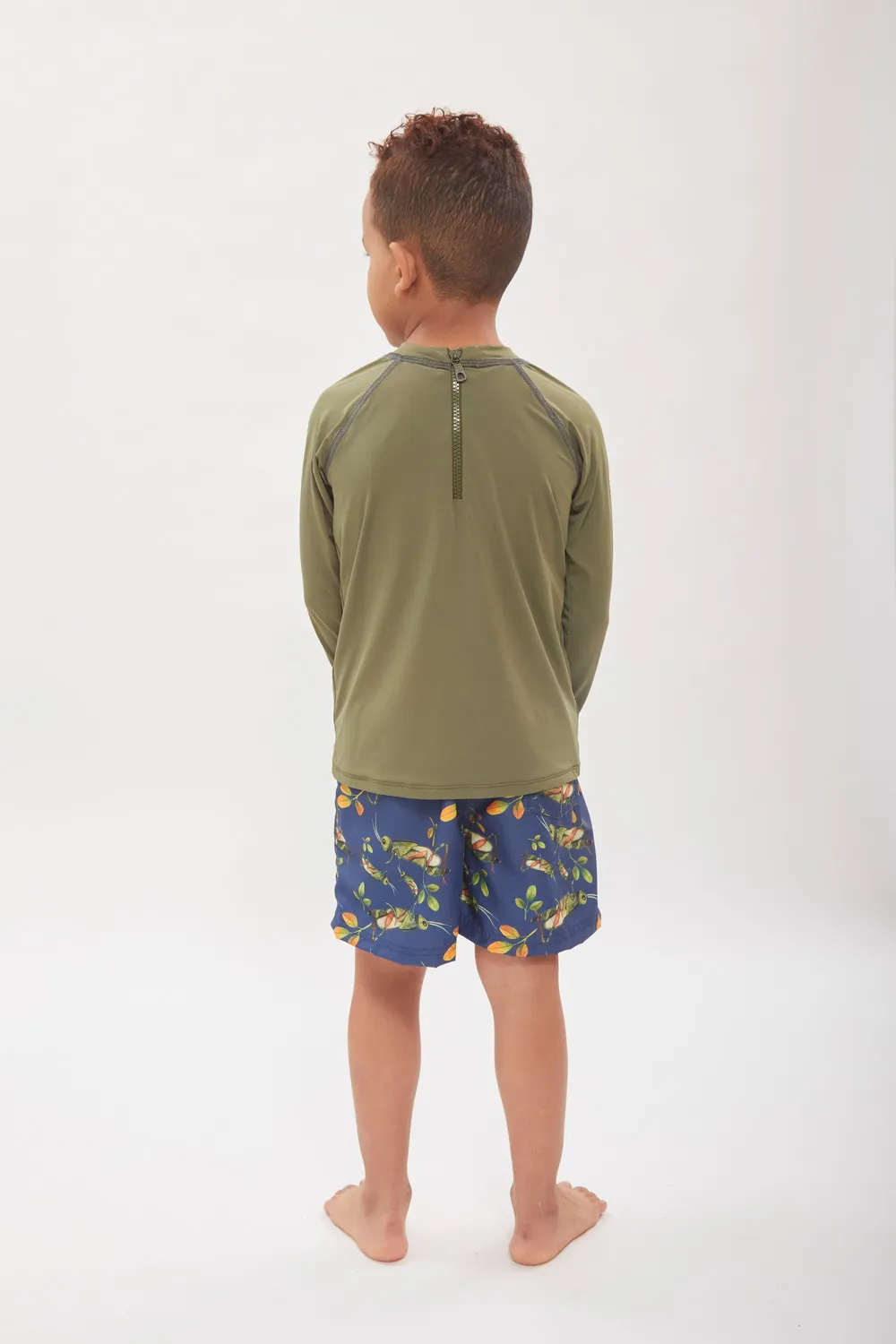 Ropa de baño de niño estilo short con un bolsillo en parte trasera y pitas ajustables en parte delantera. Tela Microtek que cuenta con Tecnología Repel para un rápido secado y protección UPF 50+.