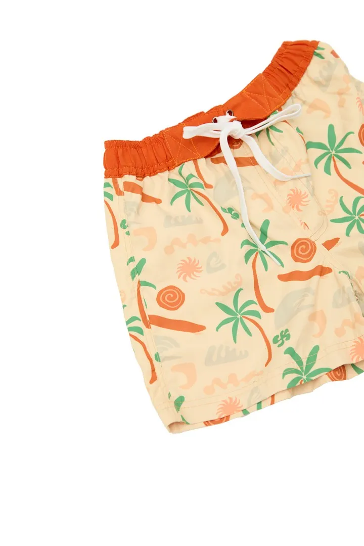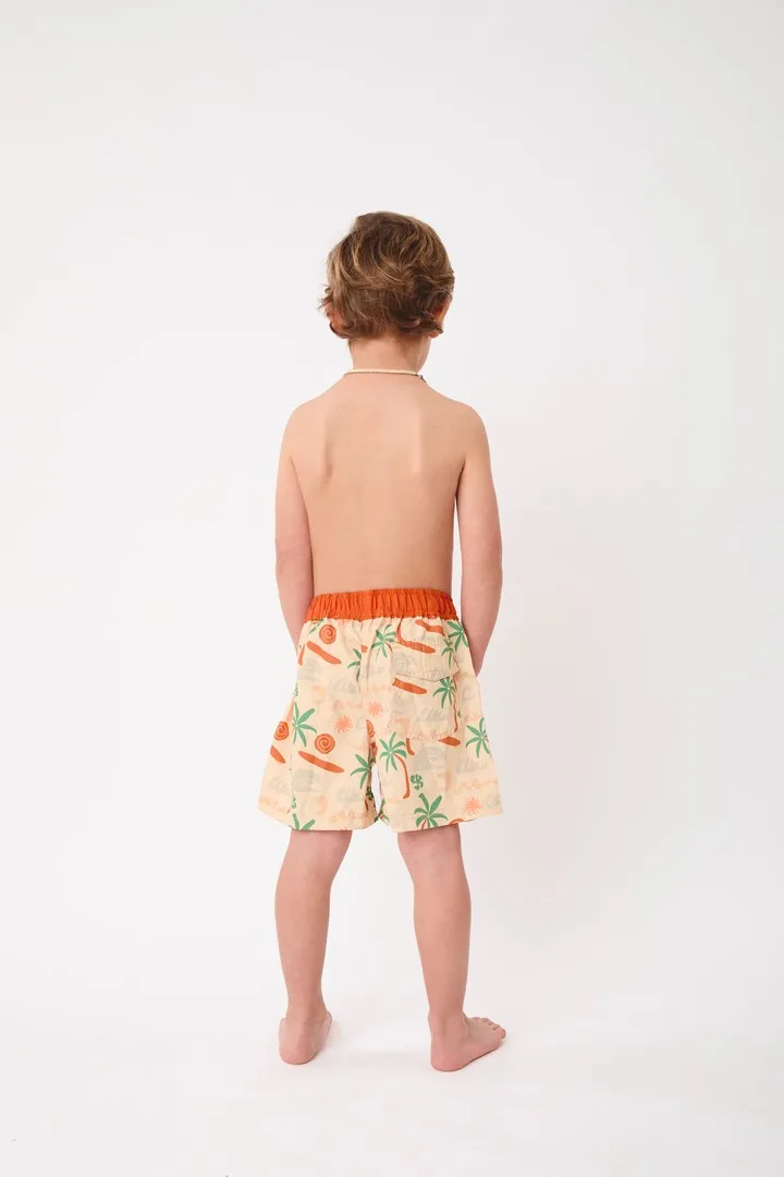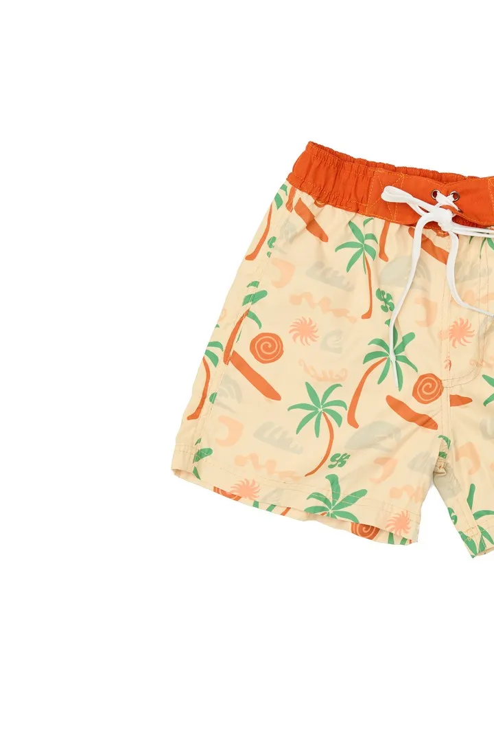 Ropa de baño de niño estilo short con un bolsillo en parte trasera y pitas ajustables en parte delantera. Tela Microtek que cuenta con Tecnología Repel para un rápido secado y protección UPF 50+.
