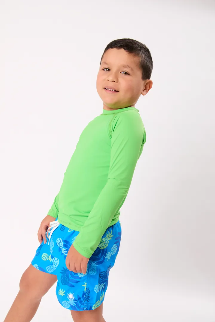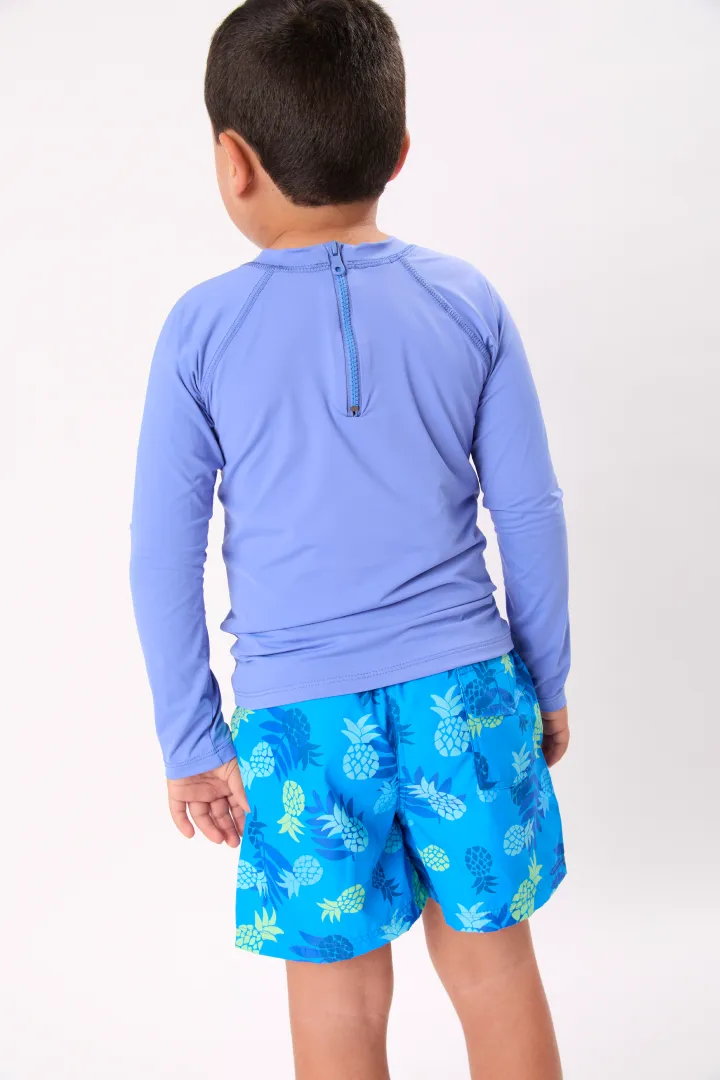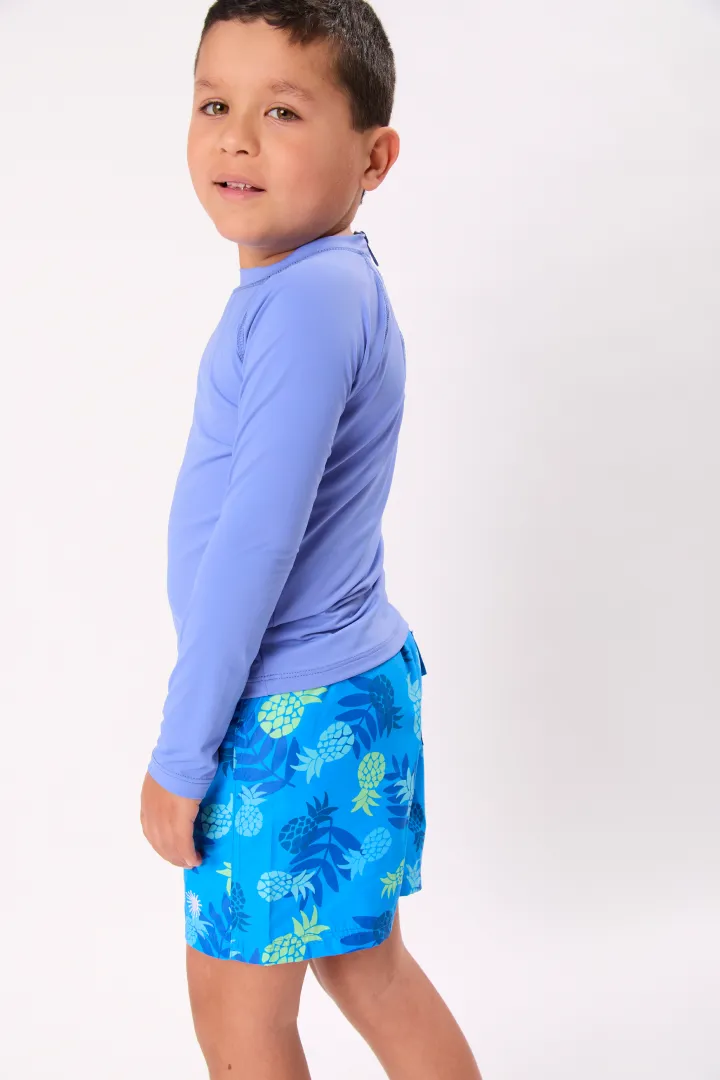Ropa de baño de niño estilo short con un bolsillo en parte trasera y pitas ajustables en parte delantera. Tela Microtek que cuenta con Tecnología Repel para un rápido secado y protección UPF 50+.