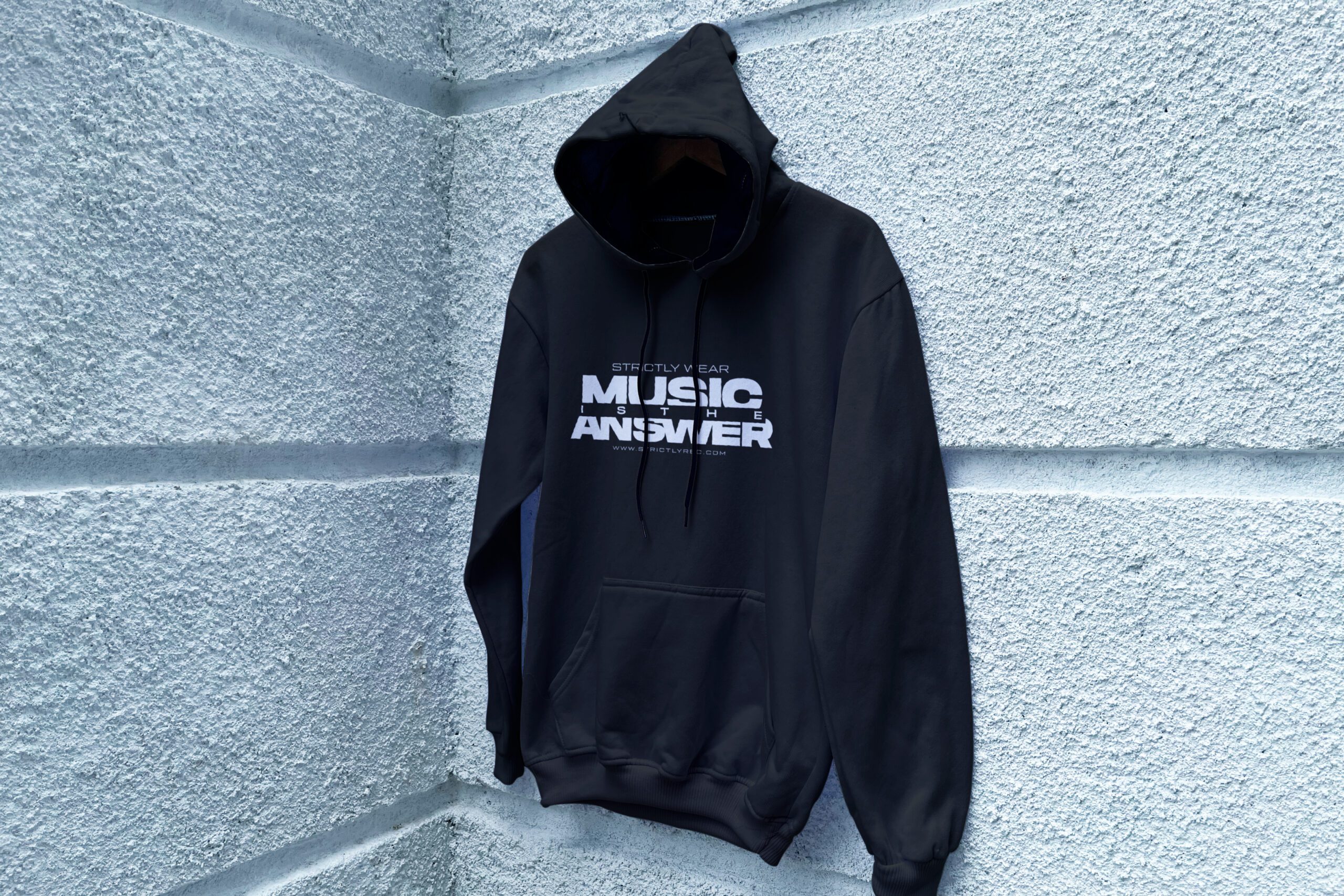 Sudadera Oversize 80% Algodón 20% Polyester de alto gramaje 320gr con diseño de impresión a tela en HQ cosido en espalda. Frontal con diseño MUSIC IS THE ANSWER en dtf de alta calidad.