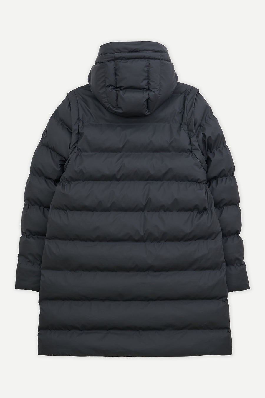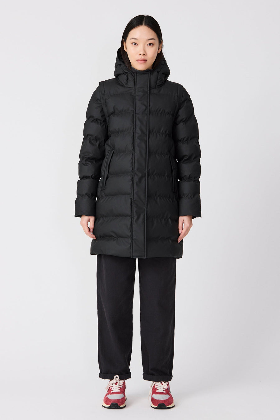 Esta prenda 2 en 1 se transforma fácilmente de un abrigo acolchado a un chaleco de entretiempo gracias a sus mangas desmontables. Cuenta con capucha fija, cremallera frontal impermeable de doble cursor con tapeta y bolsillos ribeteados que combinan estilo y funcionalidad.