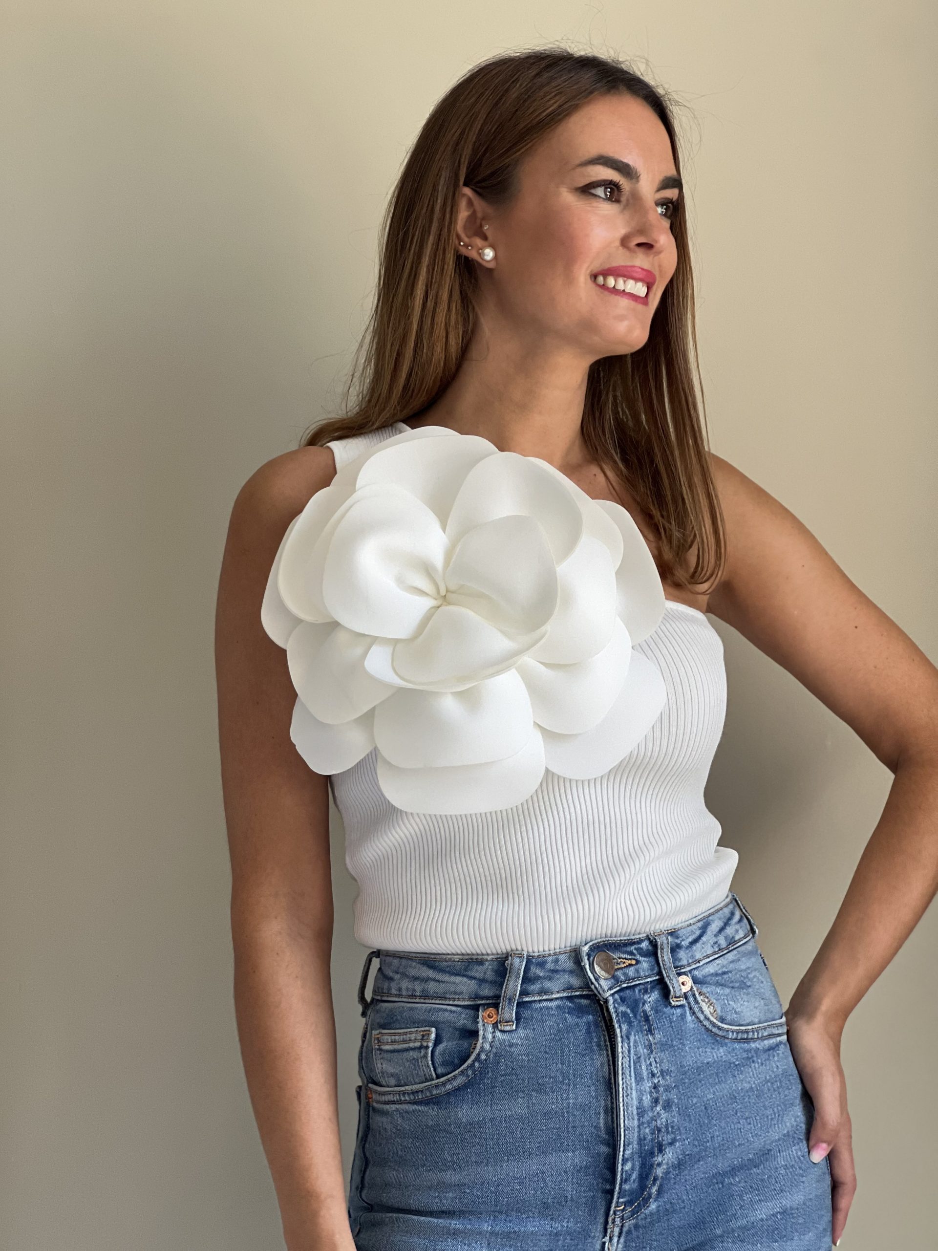 Top asimétrico blanco de canalé con detalle de maxi flor. Tejido elástico.
